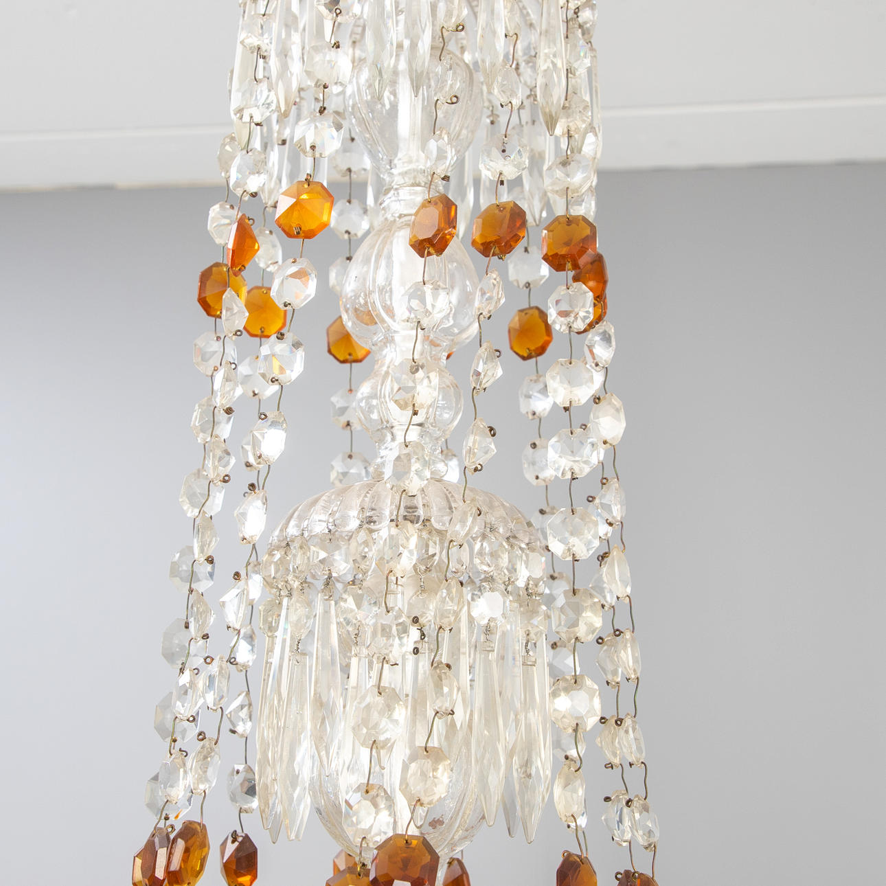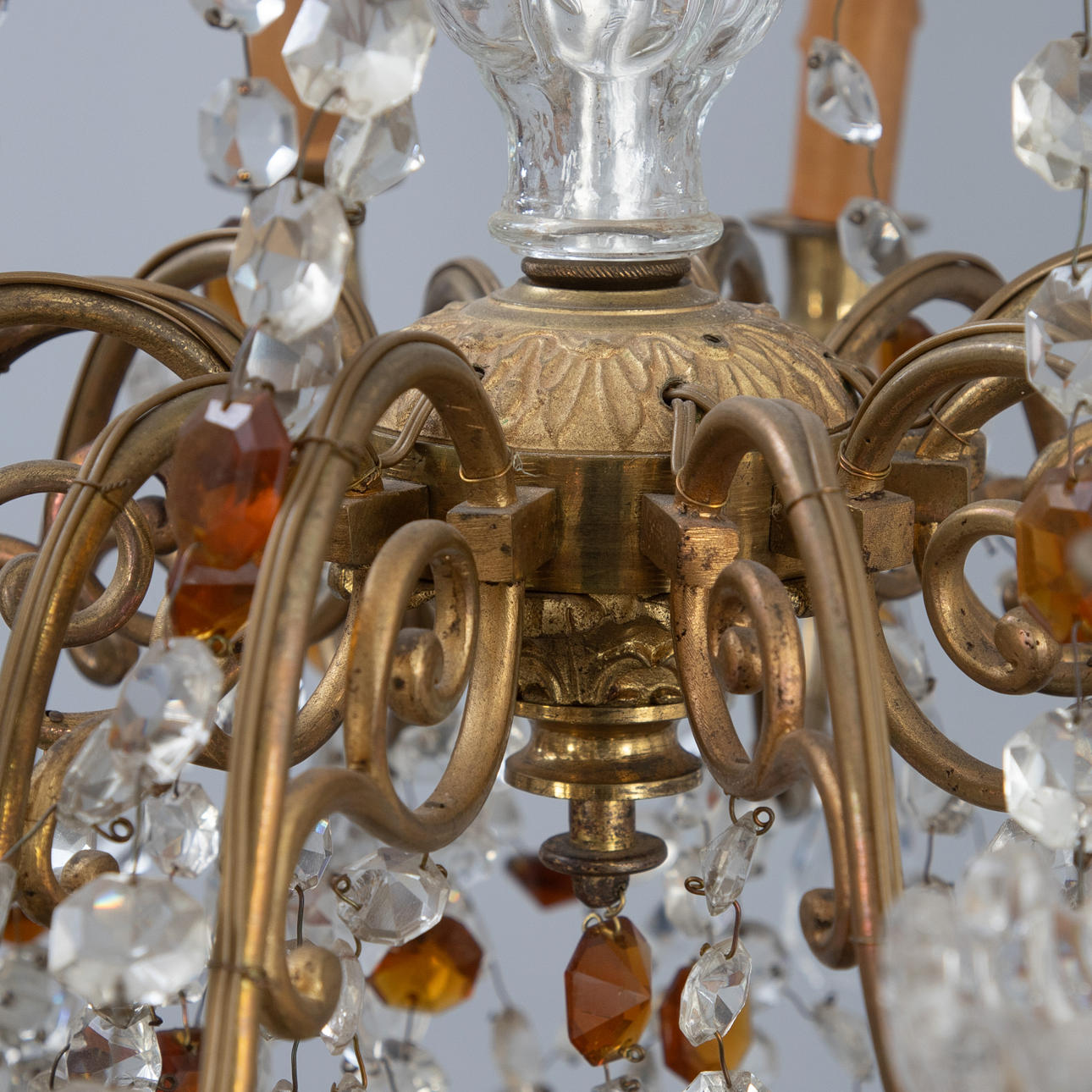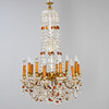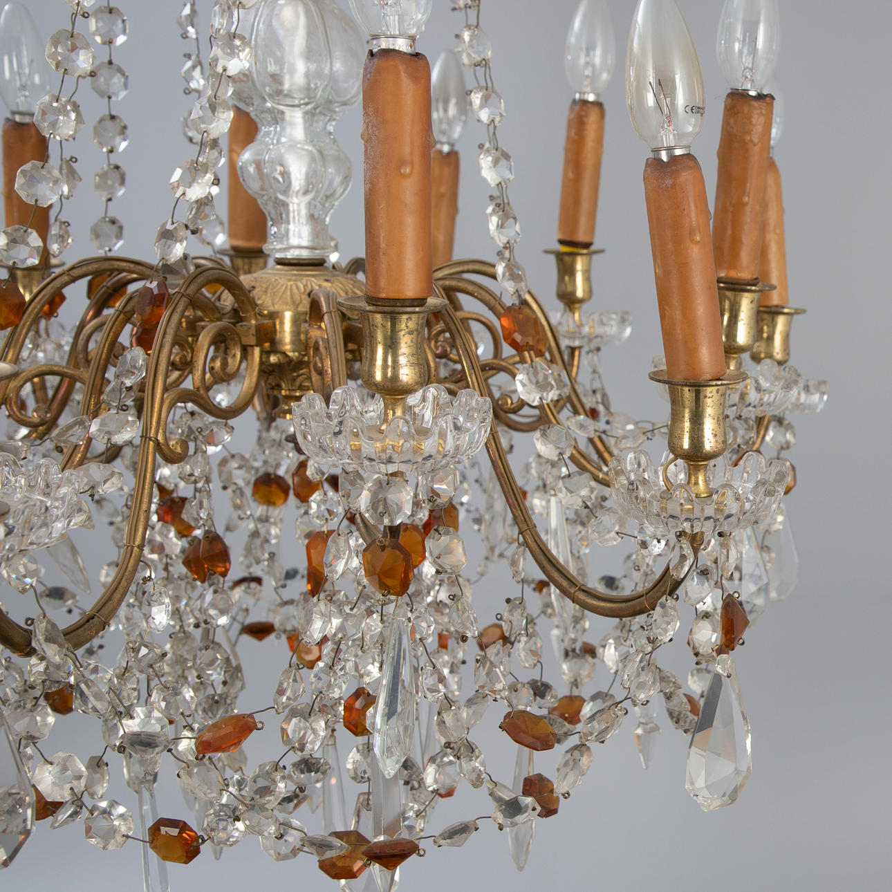 Brass/crystal glass. Baluster shaft with twelve s-shaped curved candle arms (electrified). Sumptuous glass hanging, partly amber-coloured and polished.