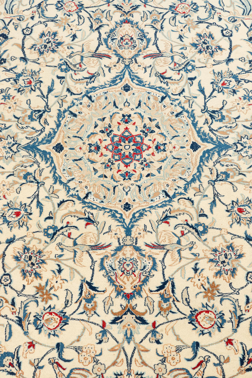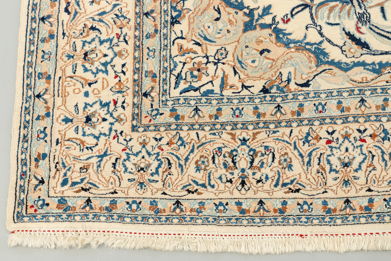 wool on cotton Birds of paradise on creamy white background. In the center, a medallion with vegetable vines.