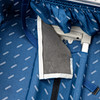 Inside with blue logo, buckle straps, compartments, 1 larger and 1 smaller with zipper.
