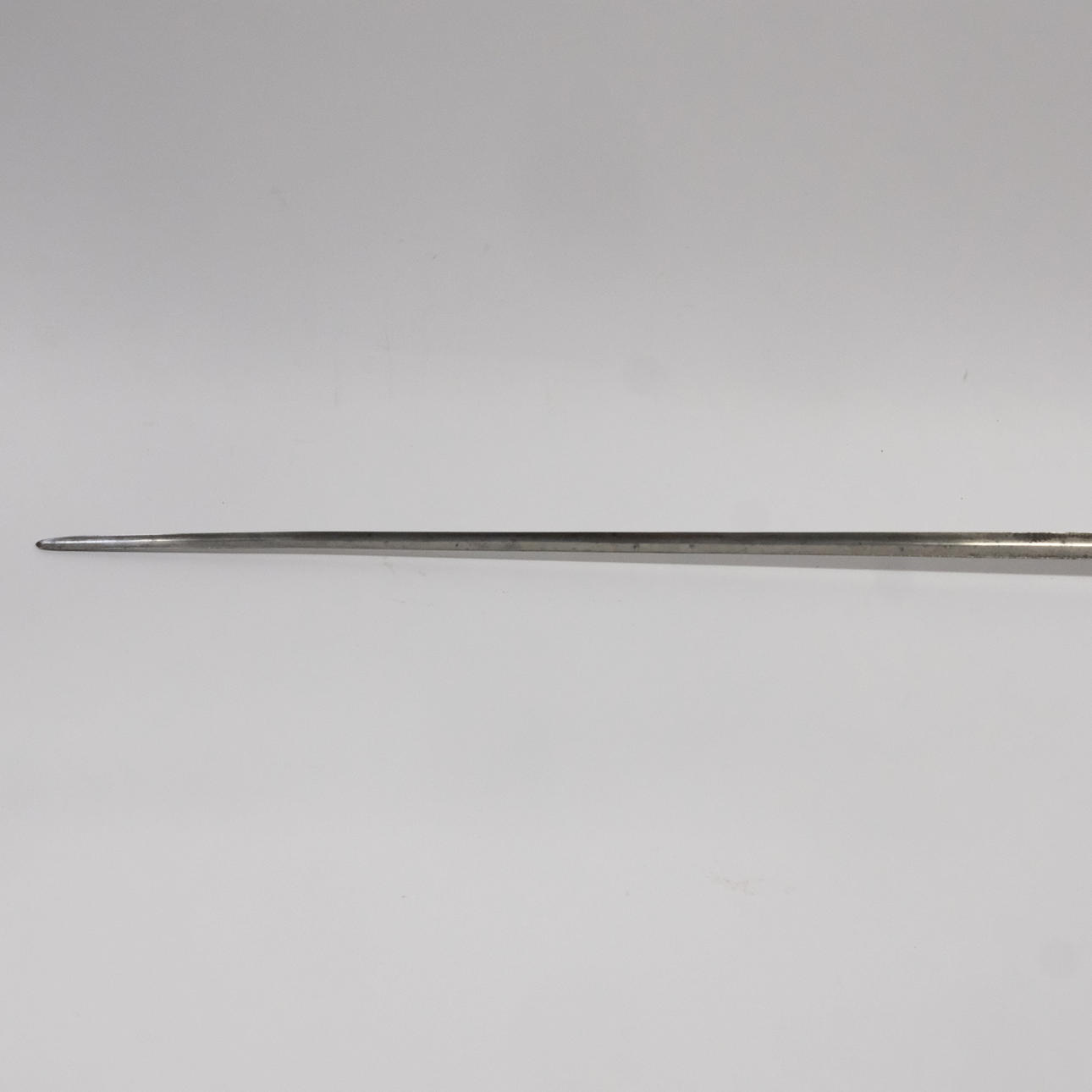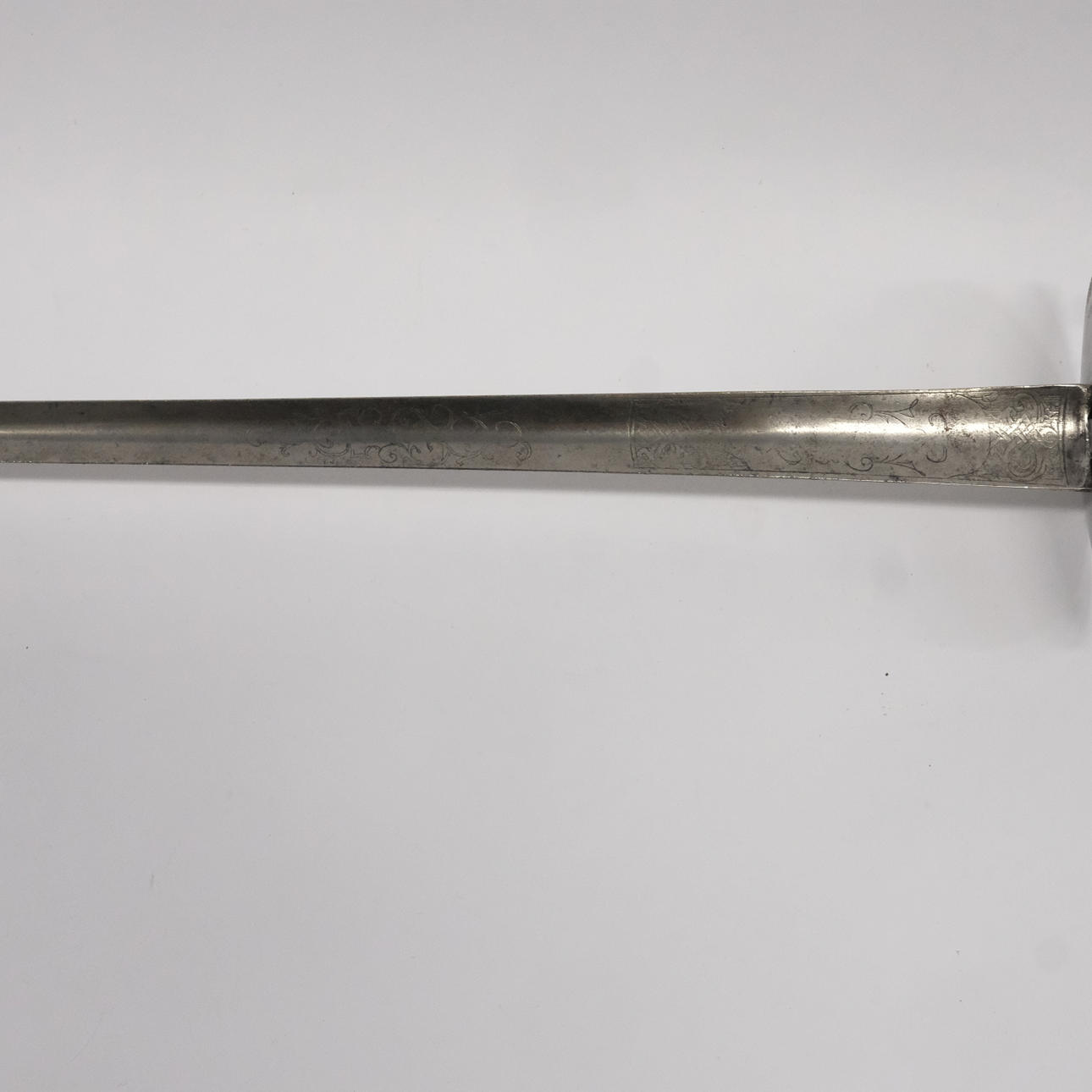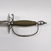 Steel bracket with faceted pommel and handlebars, rolling pin wound with brass wire, triangular stucco blade made of steel with engraved decoration, length approx. 76,5 cm, France or England, circa 1800, total length 92 cm.