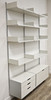 A wall mounted modular shelving system, with 8 various metal shelves (91cms and 66cms across) and two units to the base including drawers. All supported on three vertical metal brackets. 157.5cms across, 211cms high to the top of the top shelf.