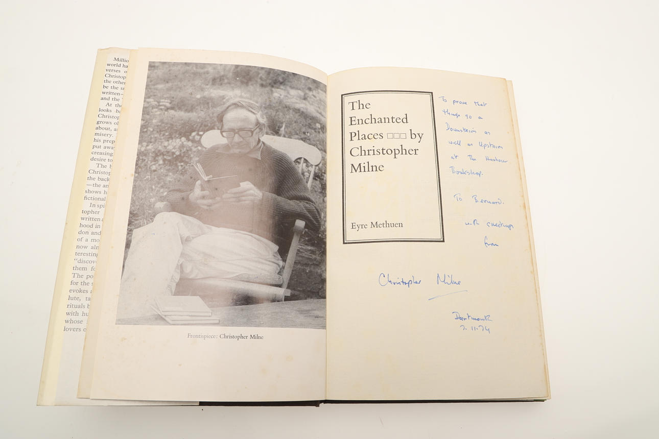 Christopher Milne. The Enchanted Places, presentation copy, inscribed 'To Bernard with greetings from Christopher Milne' to title page, photographic frontispiece, numerous further illustrations and maps, original publishers cloth, pictorial dust jacket, 8vo, London: Eyre Methuen Limited, 1974.