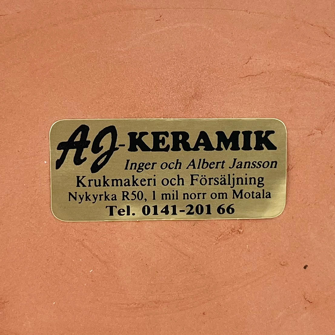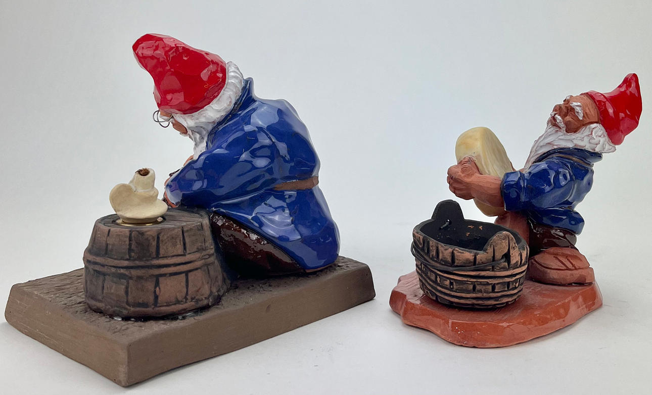 Two ceramic gnomes, Inger & Albert Jansson, Nykyrka, Motala, labeled.