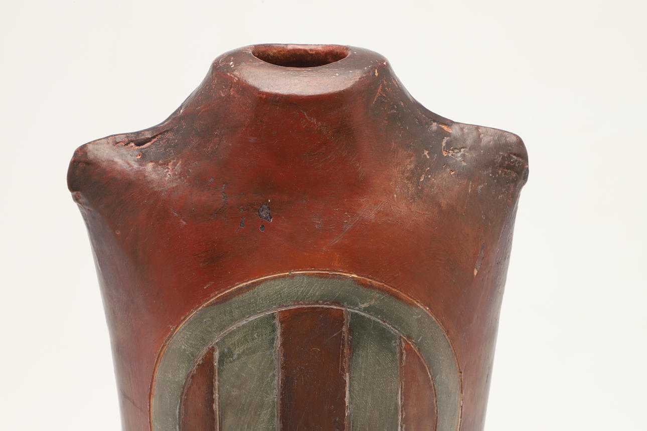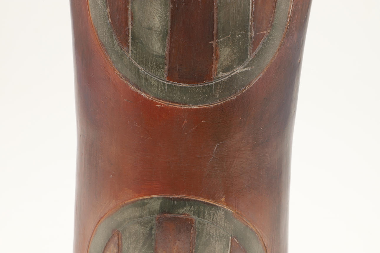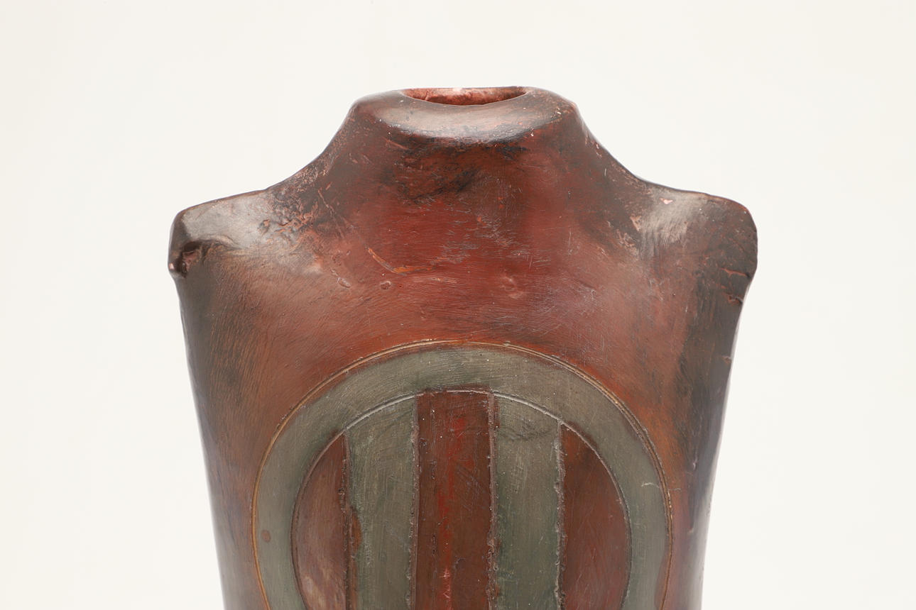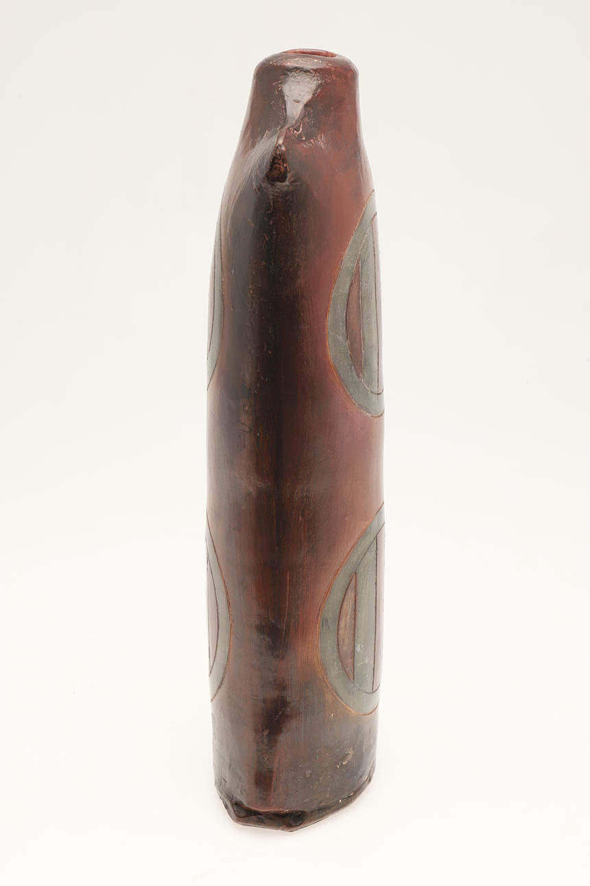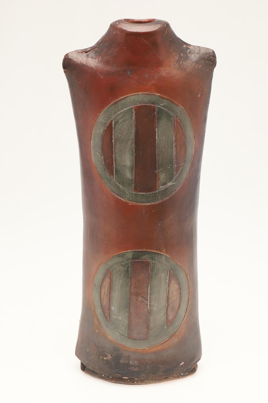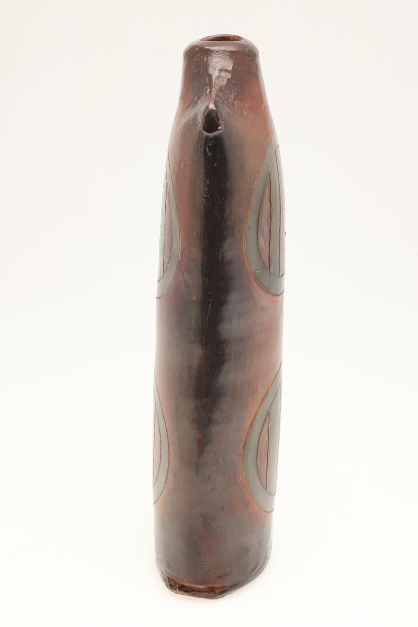 A large burnished studio pottery vase, with stylised motifs to each side and with a shaped neck. With a small leaflet about the potter, with impressed marks. 42.5cms high.