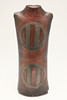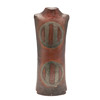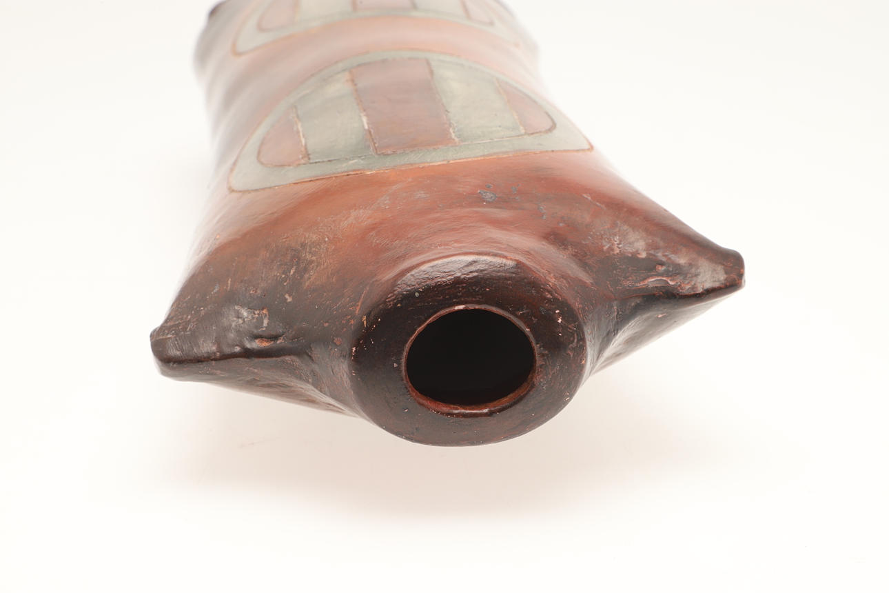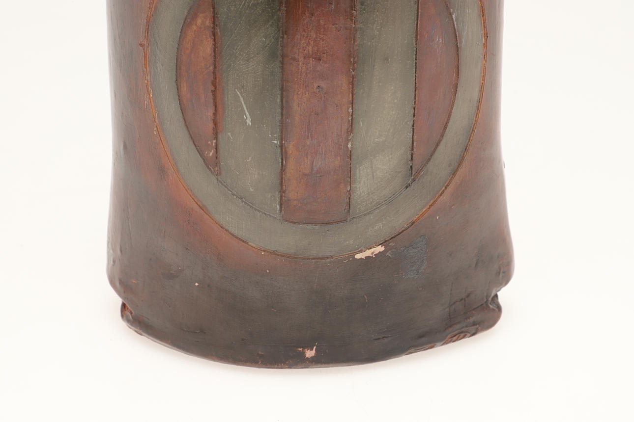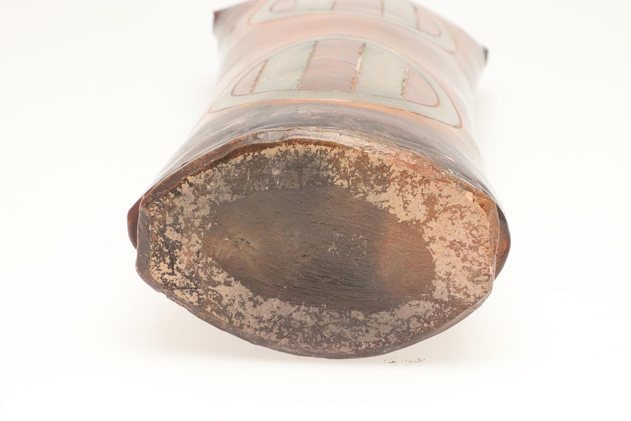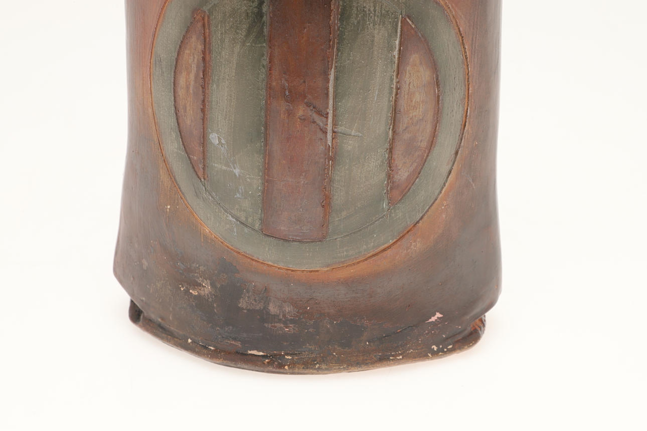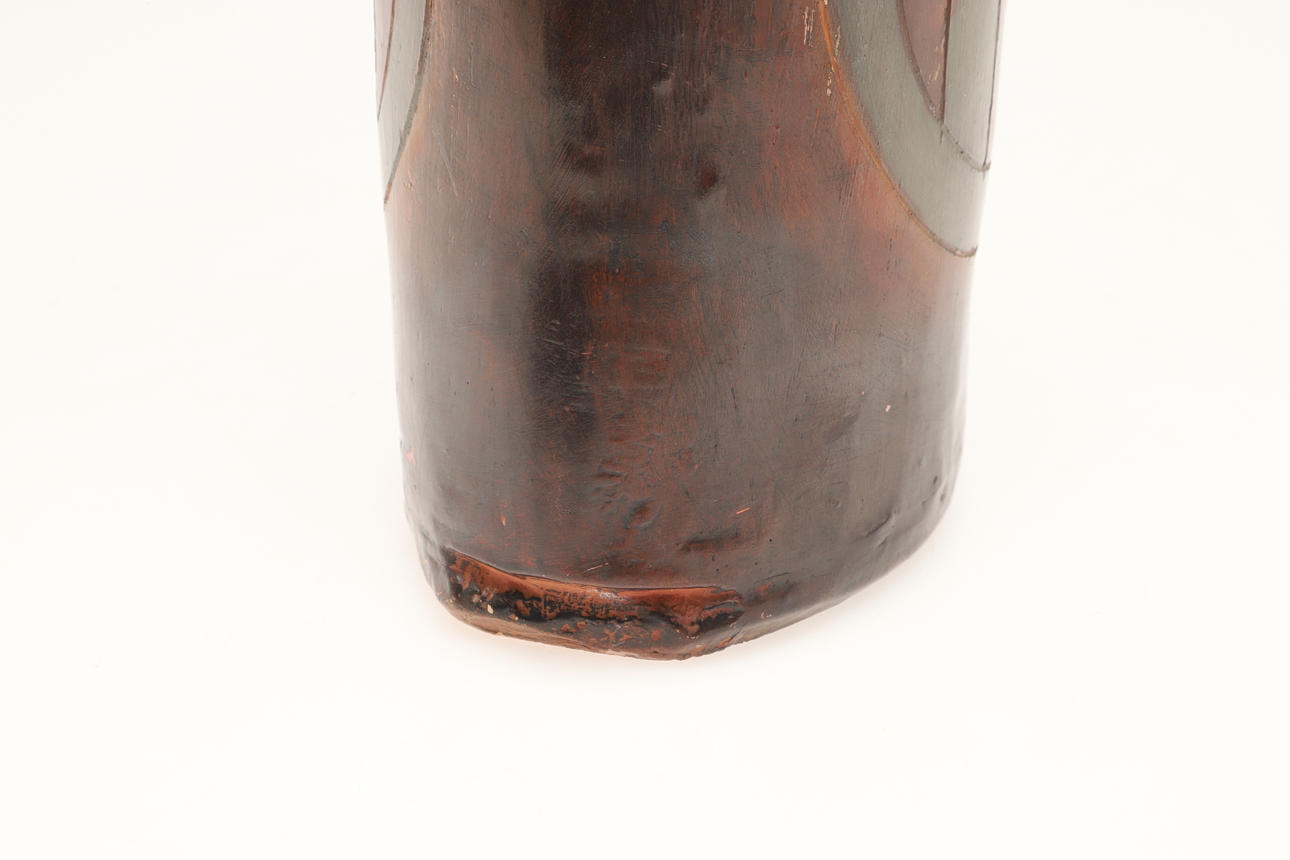A large burnished studio pottery vase, with stylised motifs to each side and with a shaped neck. With a small leaflet about the potter, with impressed marks. 42.5cms high.