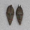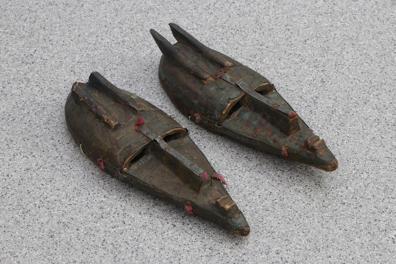 Carved wood with copper trim and textile decor. 30x10 cm.