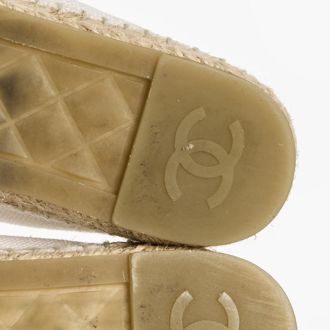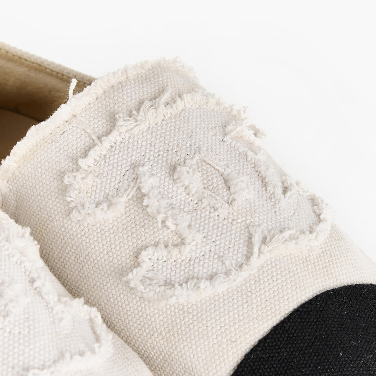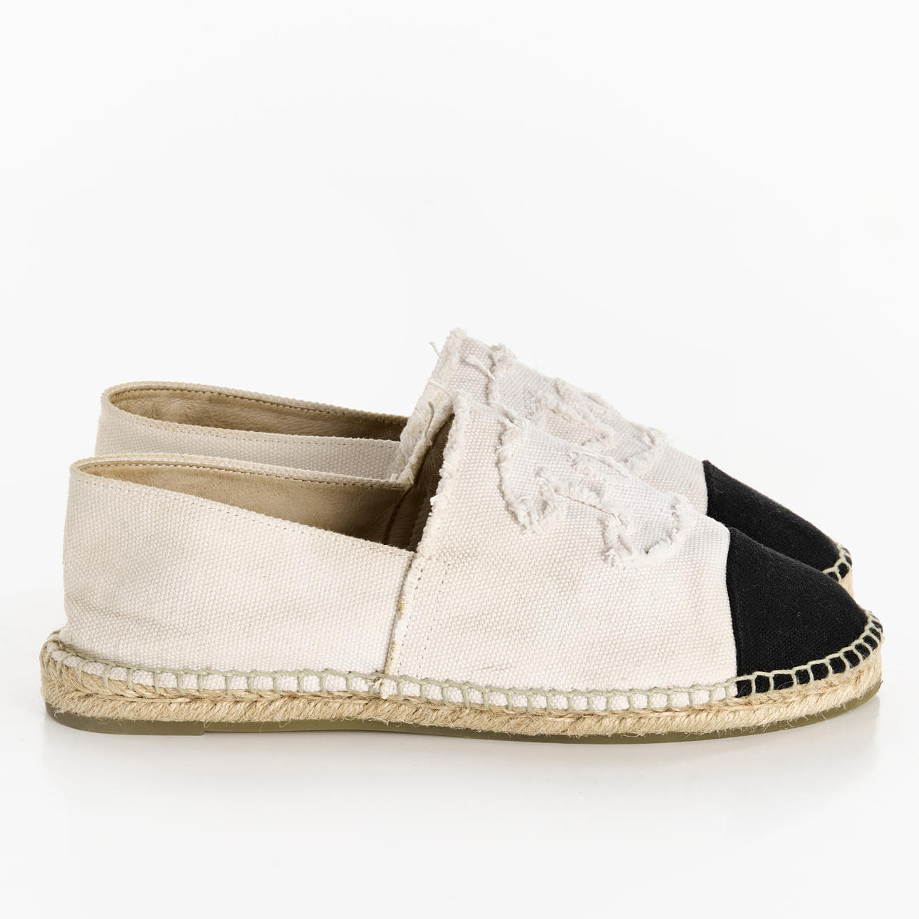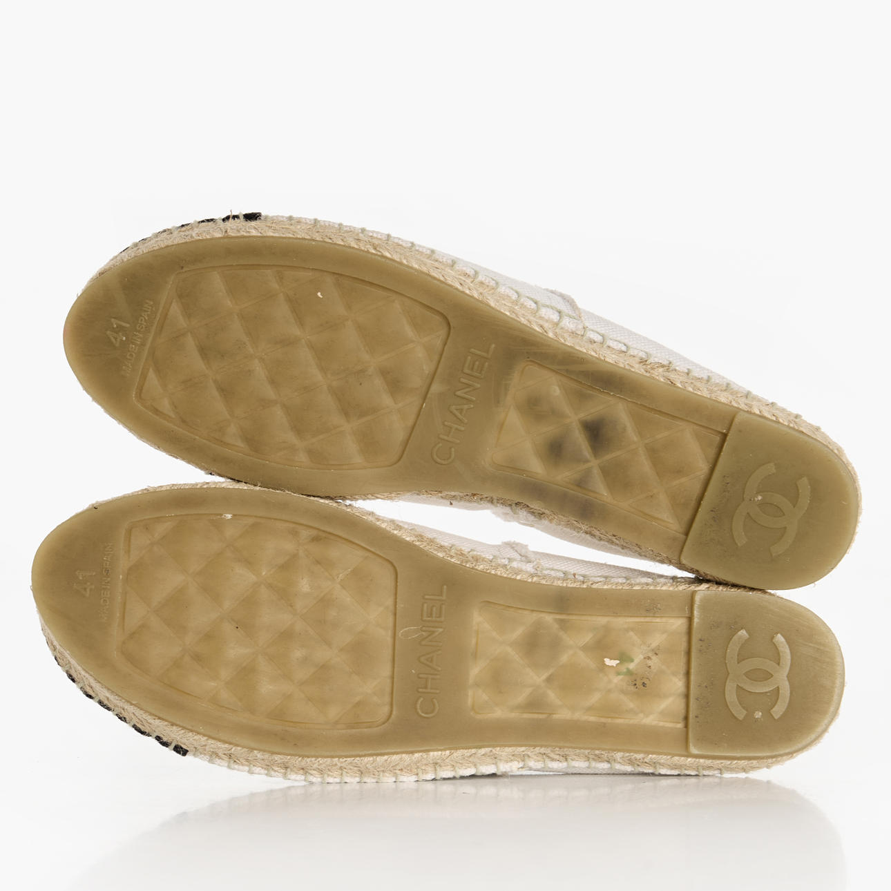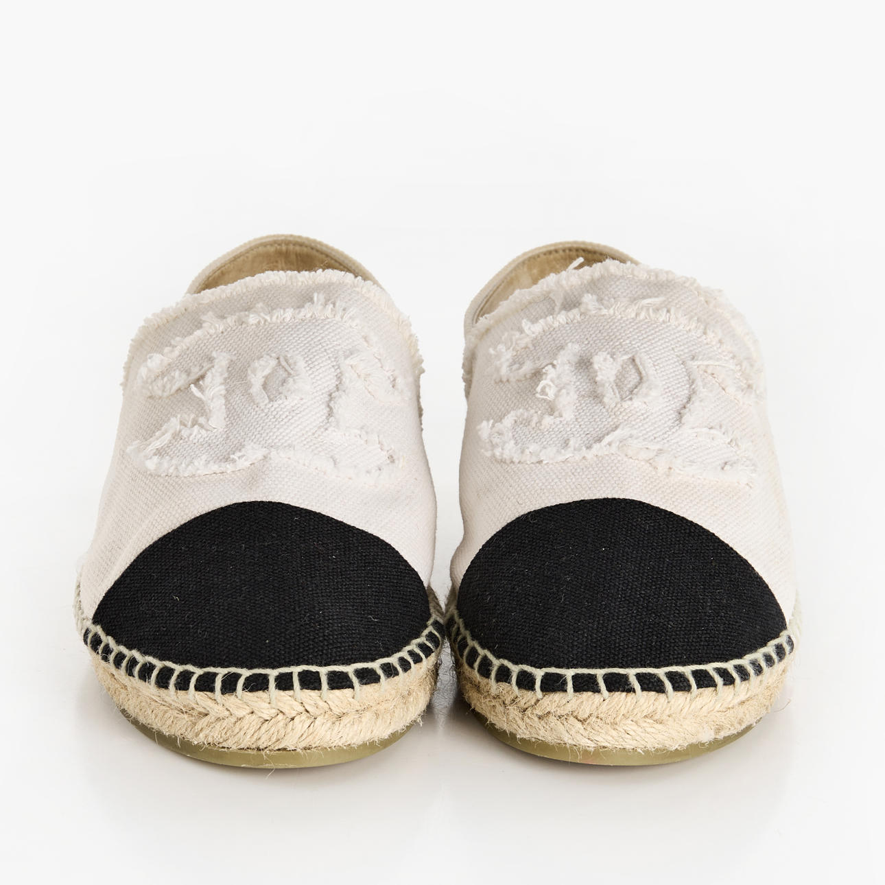 A pair of Chanel espadrilles in size 41. In white and black canvas, adorned with the classic “CC” logo.