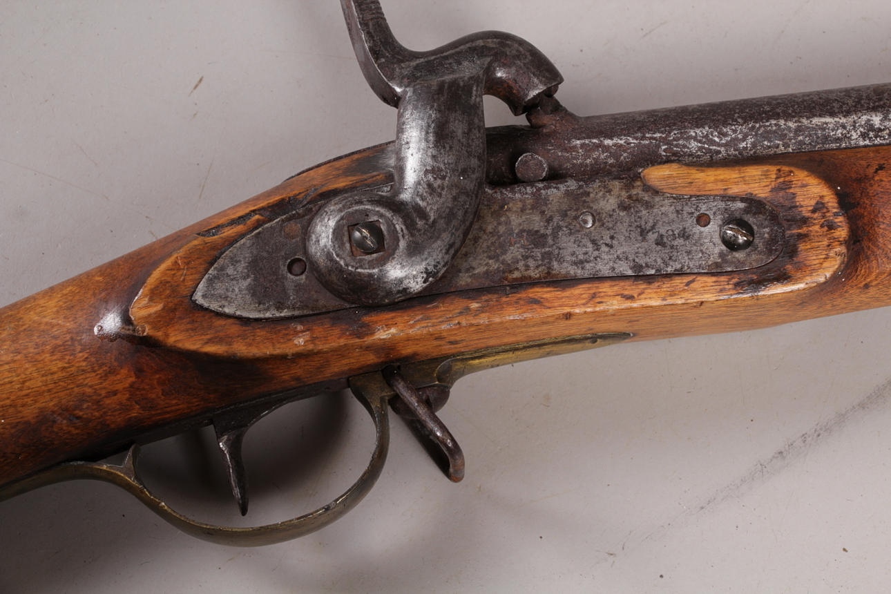 Converted from flintlock. Full stock, brass fittings, strap clips. Barrel marked 6875N5 H 17J0. Piston marked 3450 Total length 146, barrel length 105.5 cm.