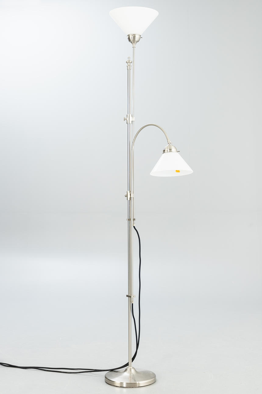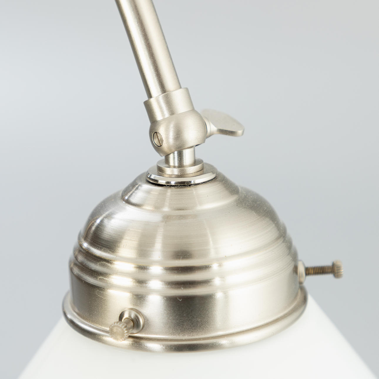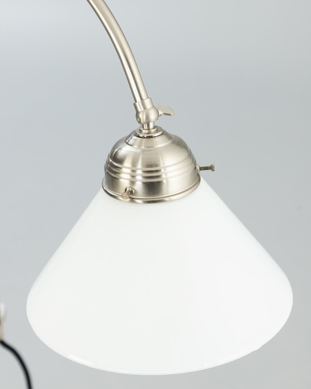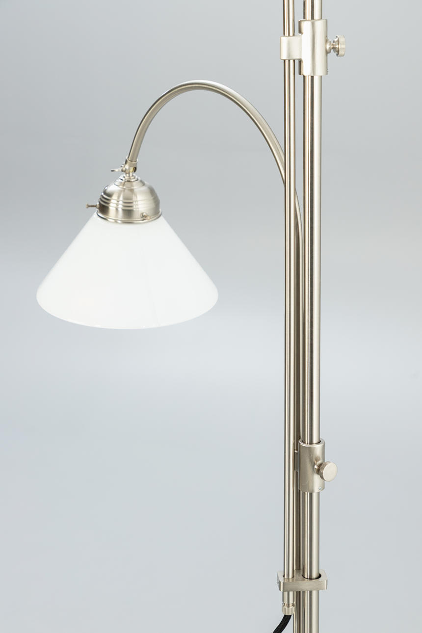 Nickel-plated brass 2 adjustable lamp arms. Lampshades in opal glass, white.