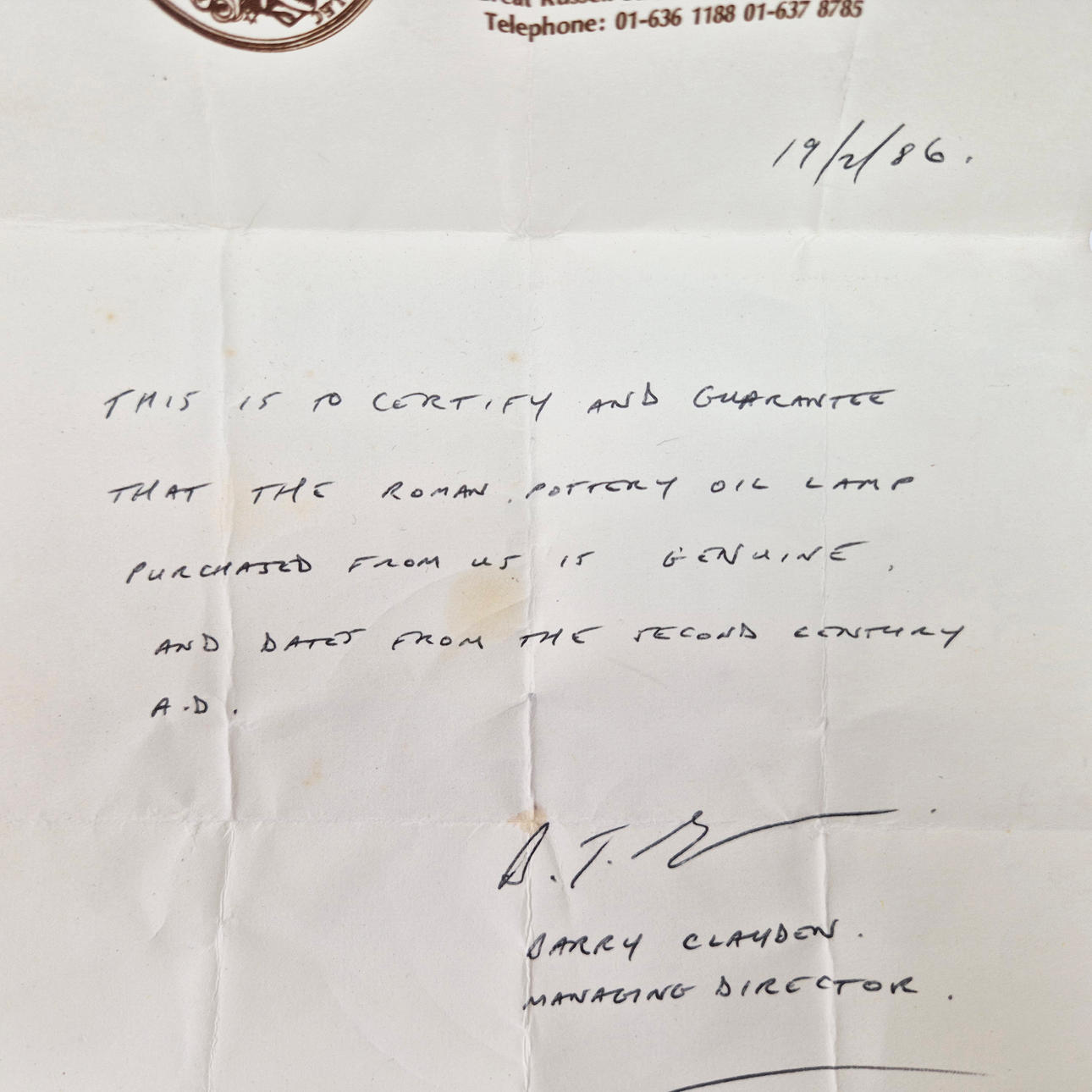 second century A.D., with certificate of authenticity from Coincraft. 10cm W x 4cm H.