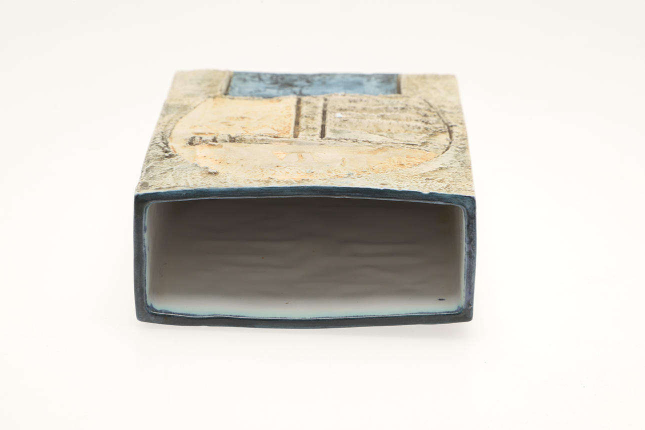 A Troika rectangular shaped slab vase, with a stylised design to each side and with a white glazed interior and sides. Painted marks to the base, Troika, Cornwall, LT (possibly Linda Taylor). 17.5cms high, 11.5cms across at widest point.