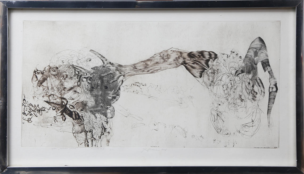 Foxing. It has not been examined without frame. Aluminium frame, with slight dents.