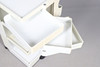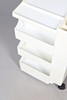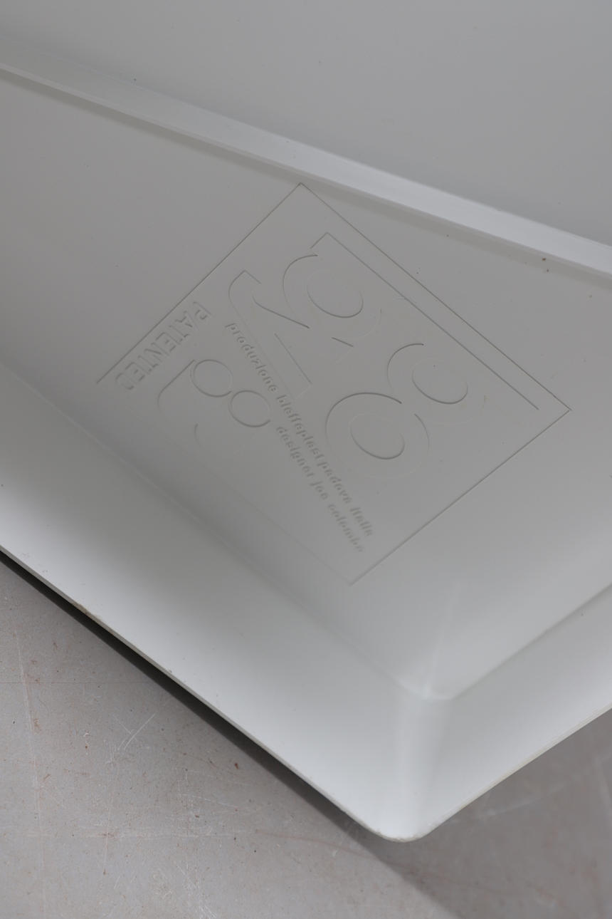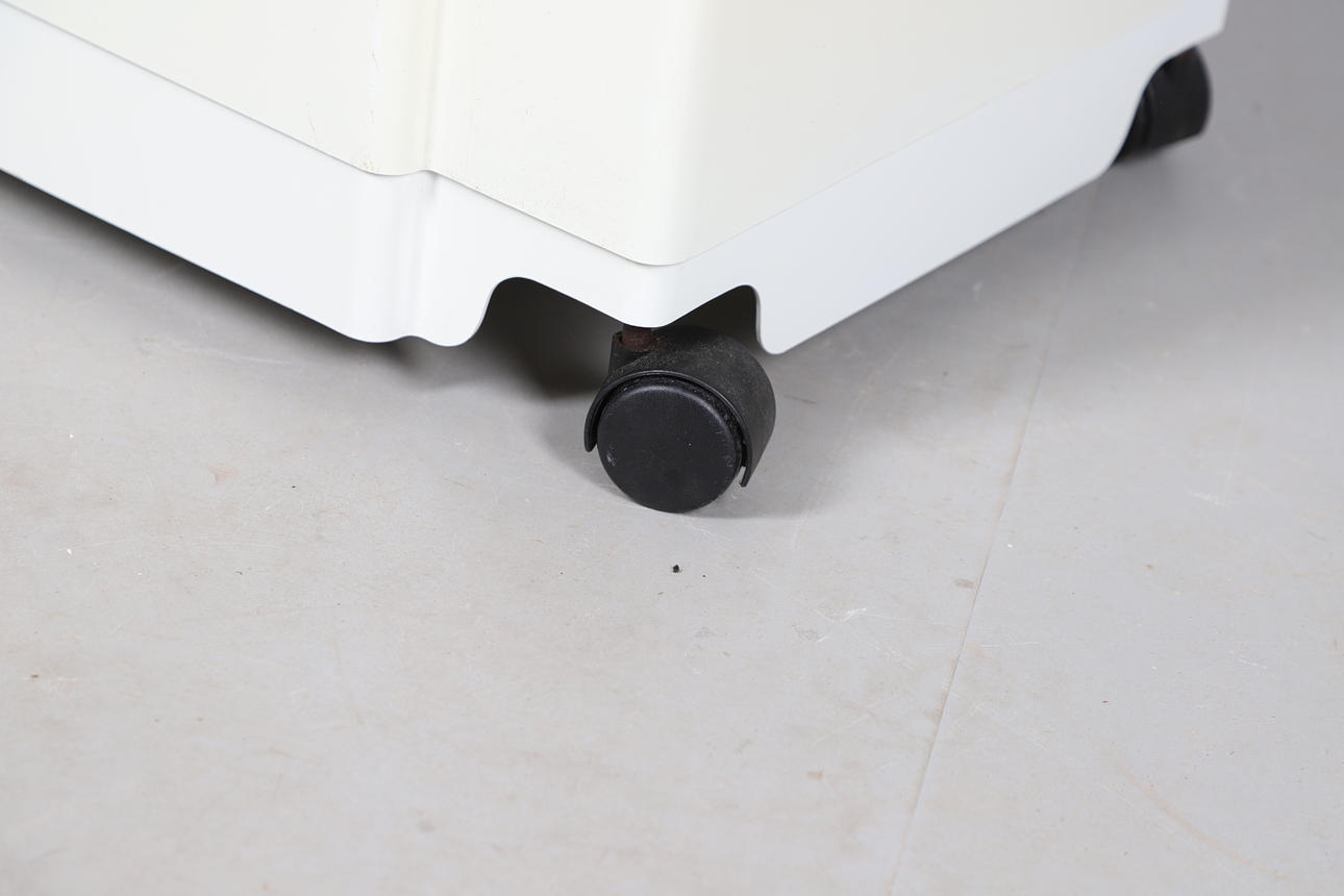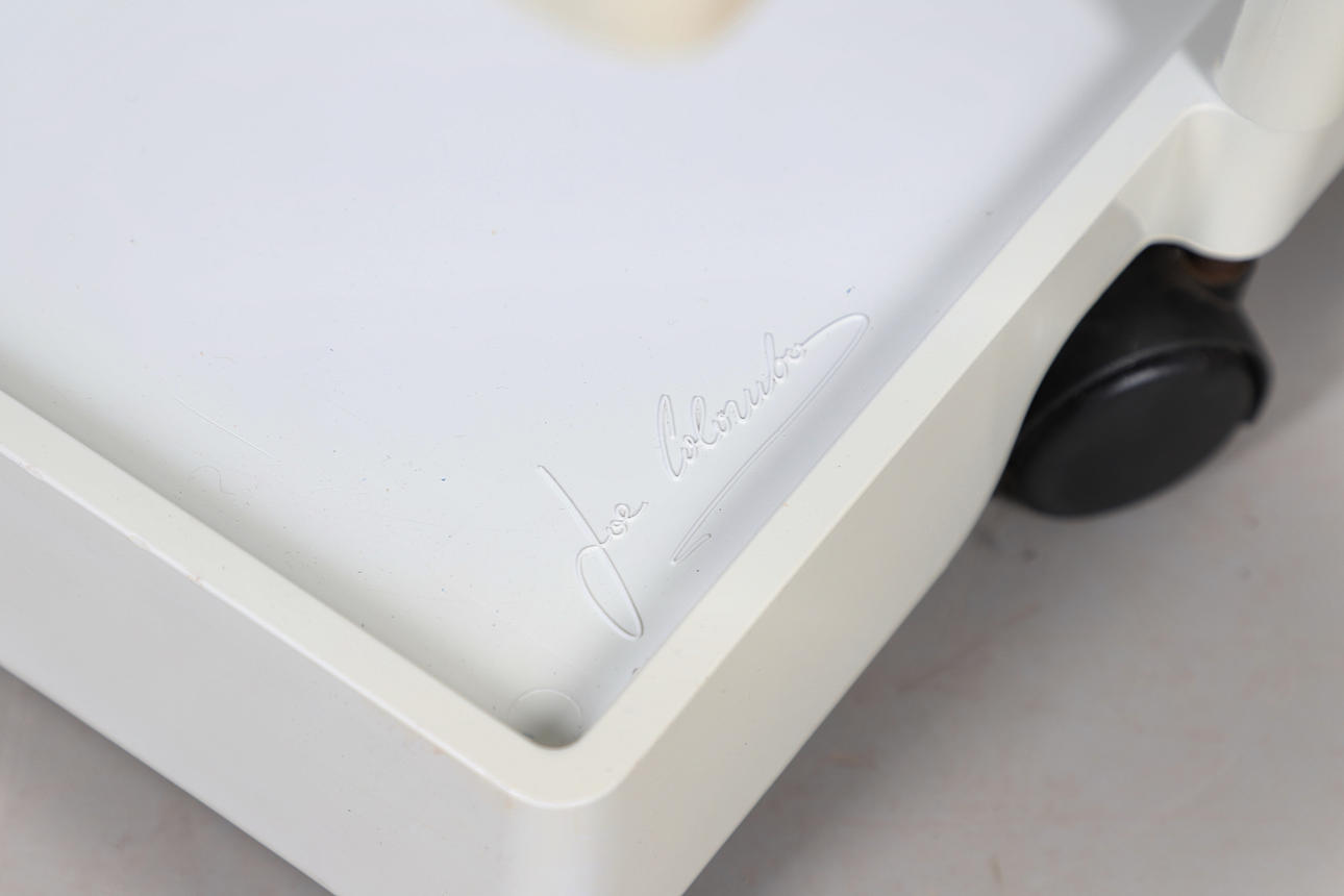 Designed in 1970, made in moulded white plastic with an arrangement of compartments and raised on black castors. With a facsimile signature for Joe Columbo and factory marks to the base. 74cms high, top approx 42.5cms by 41cms.