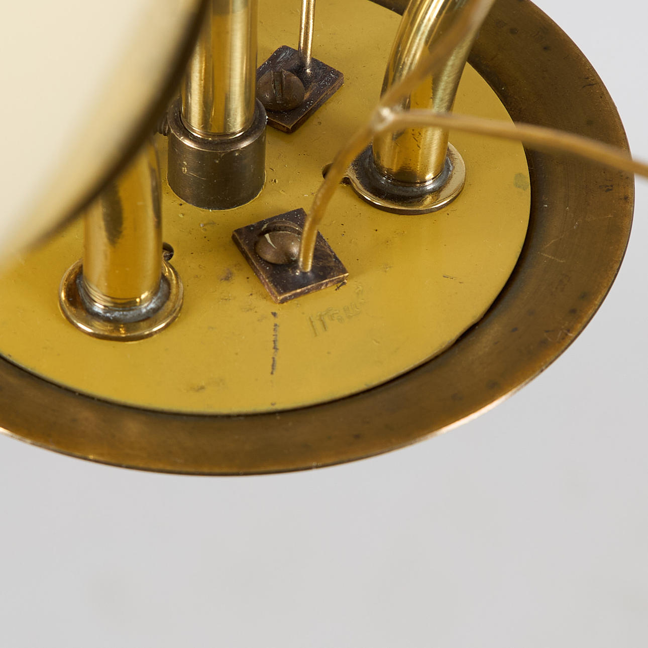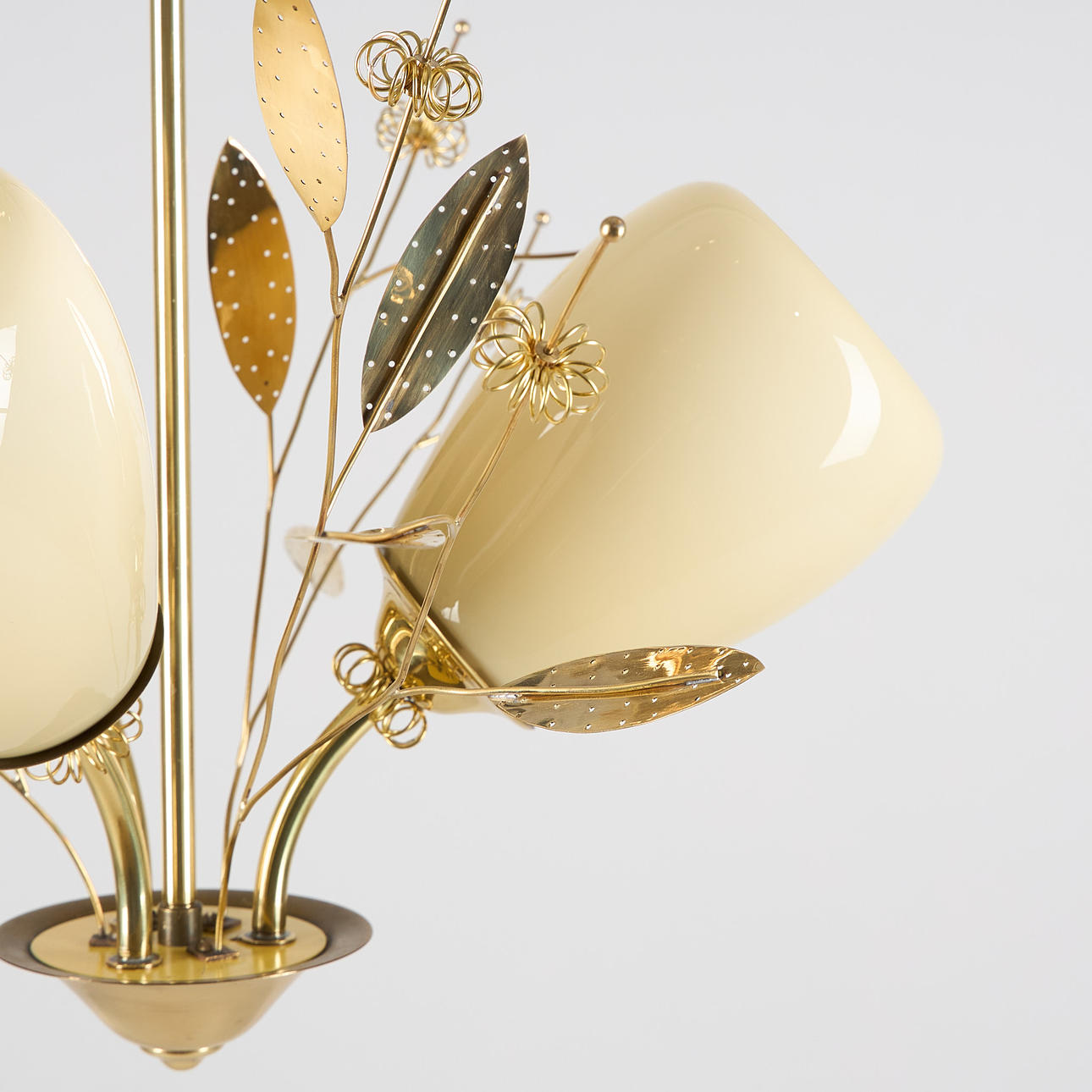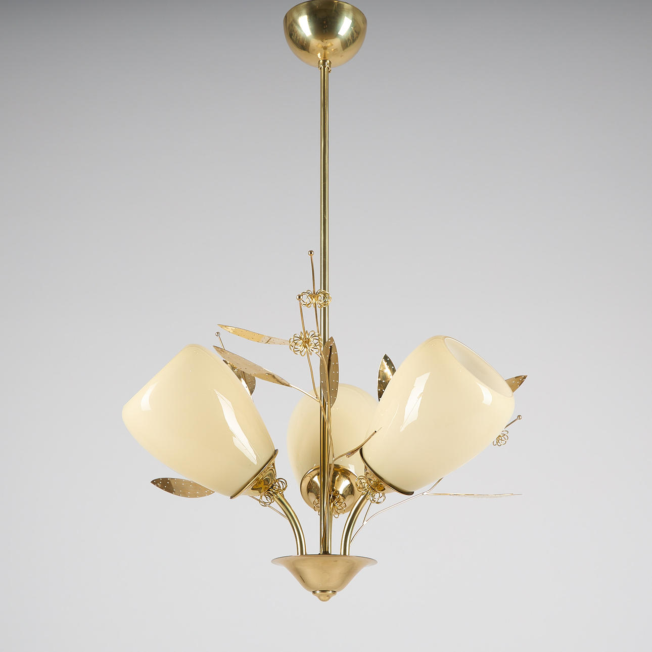 Brass frame, opal glass cups, three bright spots. With the manufacturer's stamp. Height 67 cm, cup diameter approx. 11 cm.