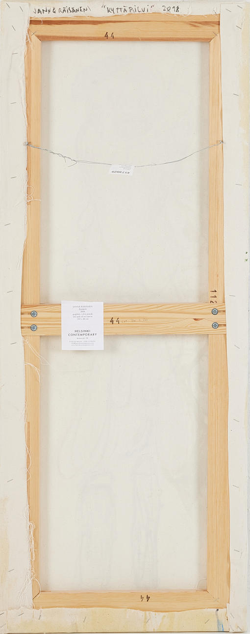 Graphite, crayon, ink and oil on canvas, 112 x 44 cm. Signed Janne Räişanen and dated 2018 on verso.