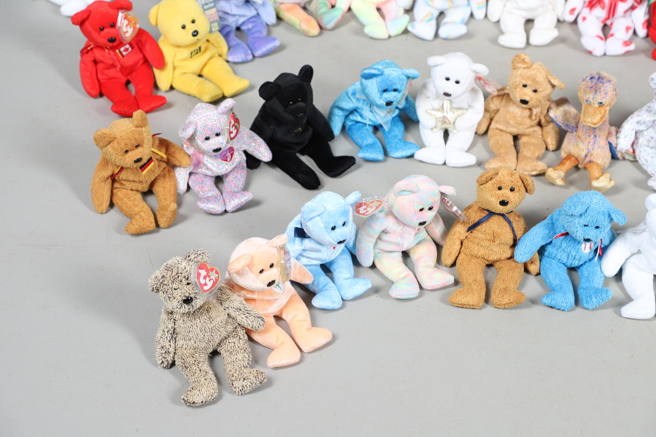 A collection of TY Beanie Bears, including some larger examples, Elephant (39cms long), Snowman (35cms high), Fairy (34cms high), and other larger examples. Also with a qty of smaller TY Beanie Bears, some with attached tags.