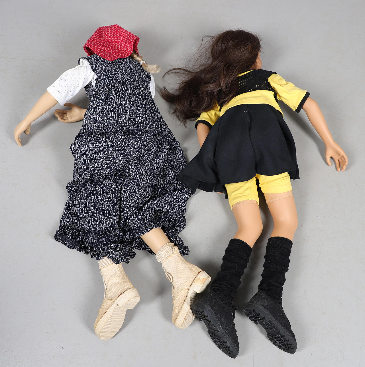 Two very large vinyl dolls, designed by Elizabeth Lindner for Gotz. Both fully clothed and with marks to the back of the neck. Approx 99cms high each.