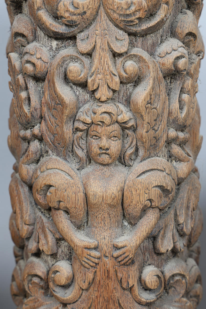 the capitals with splits and cracks, woodworm, the other with some minor chips otherwise in good order.