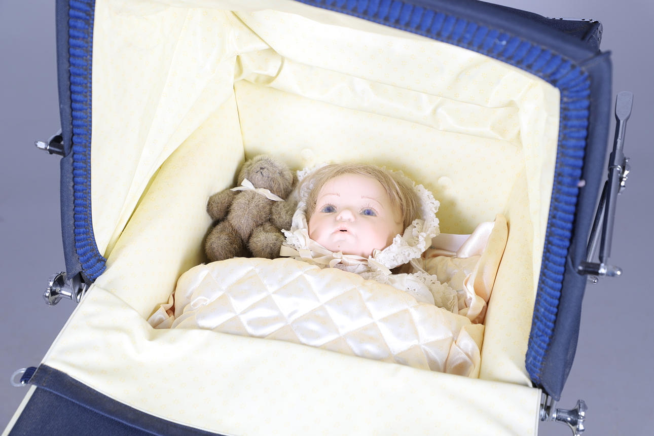 A Silver Cross Millennium Pram, with various paperwork when purchased including booklet. Carriage No 925, also with a modern doll. 93cms long, 78cms high with hood down.