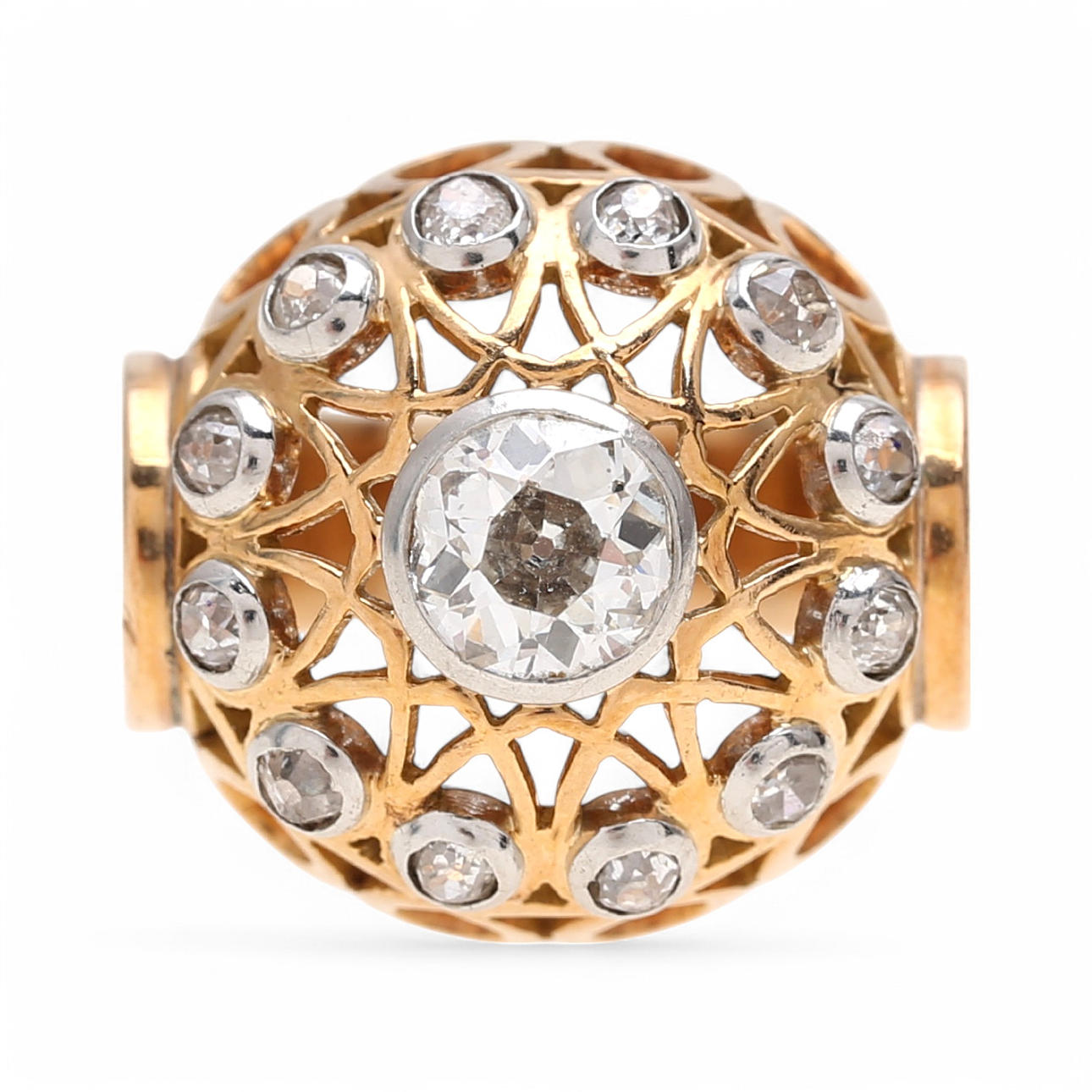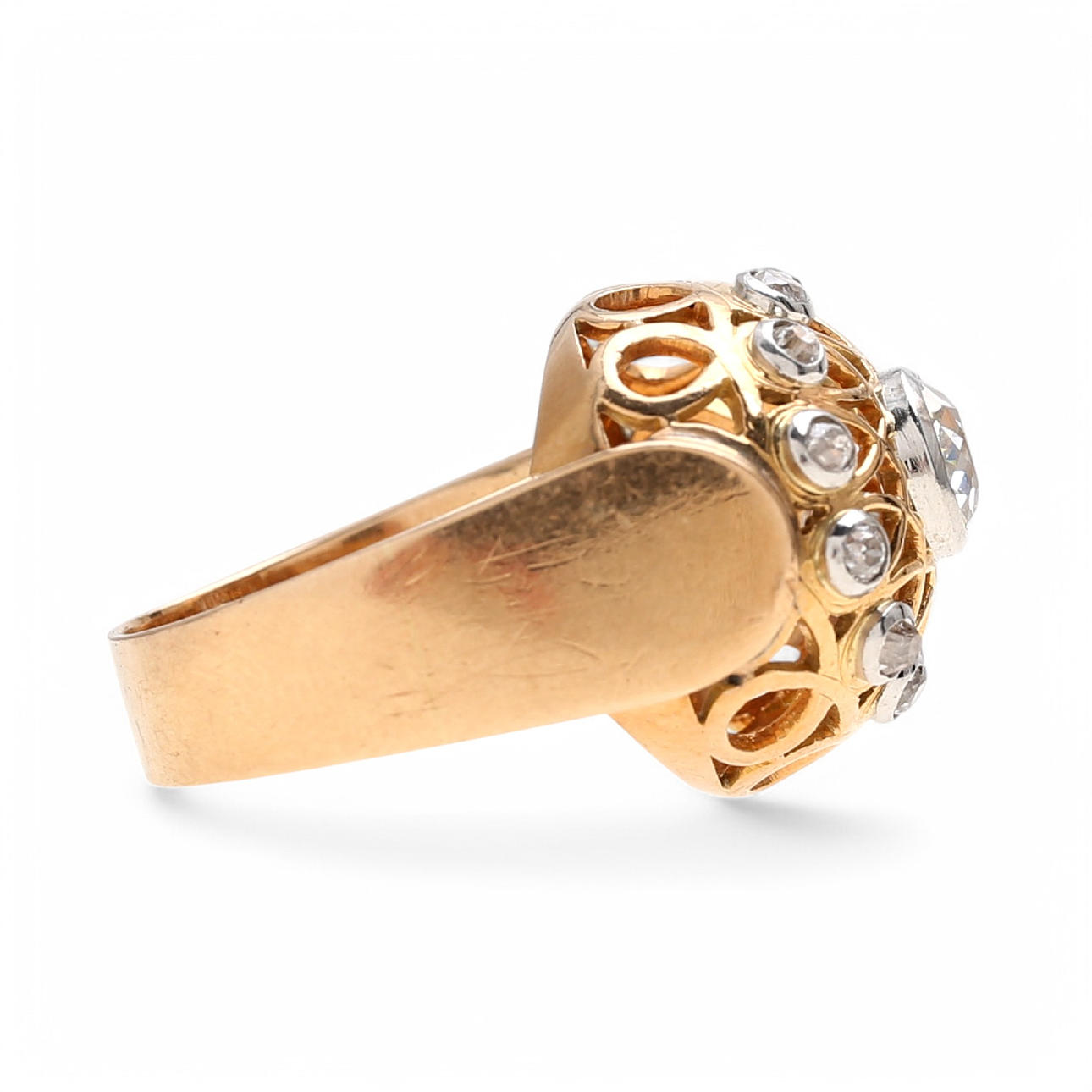 18K gold with platinum views, and old brilliant, old cushon and 8/8 cut diamonds, approx. 0.96 cts. Hallmarked. Size 12/52. 11.8 gr.
