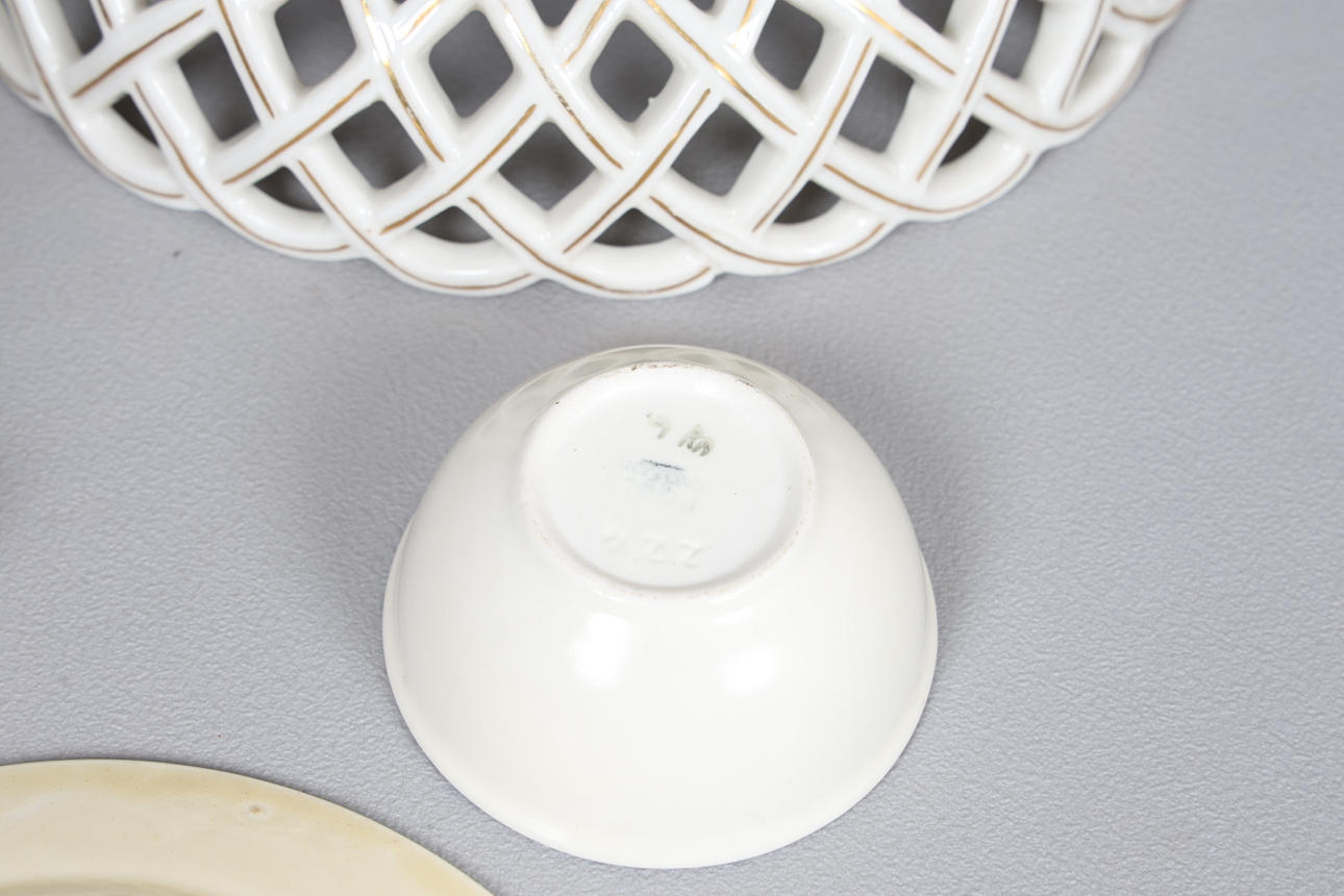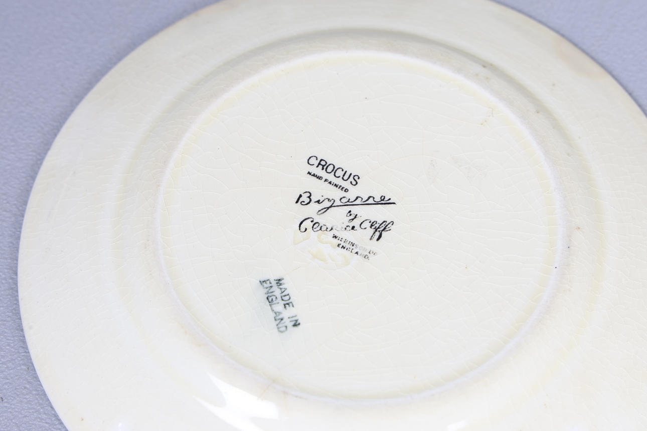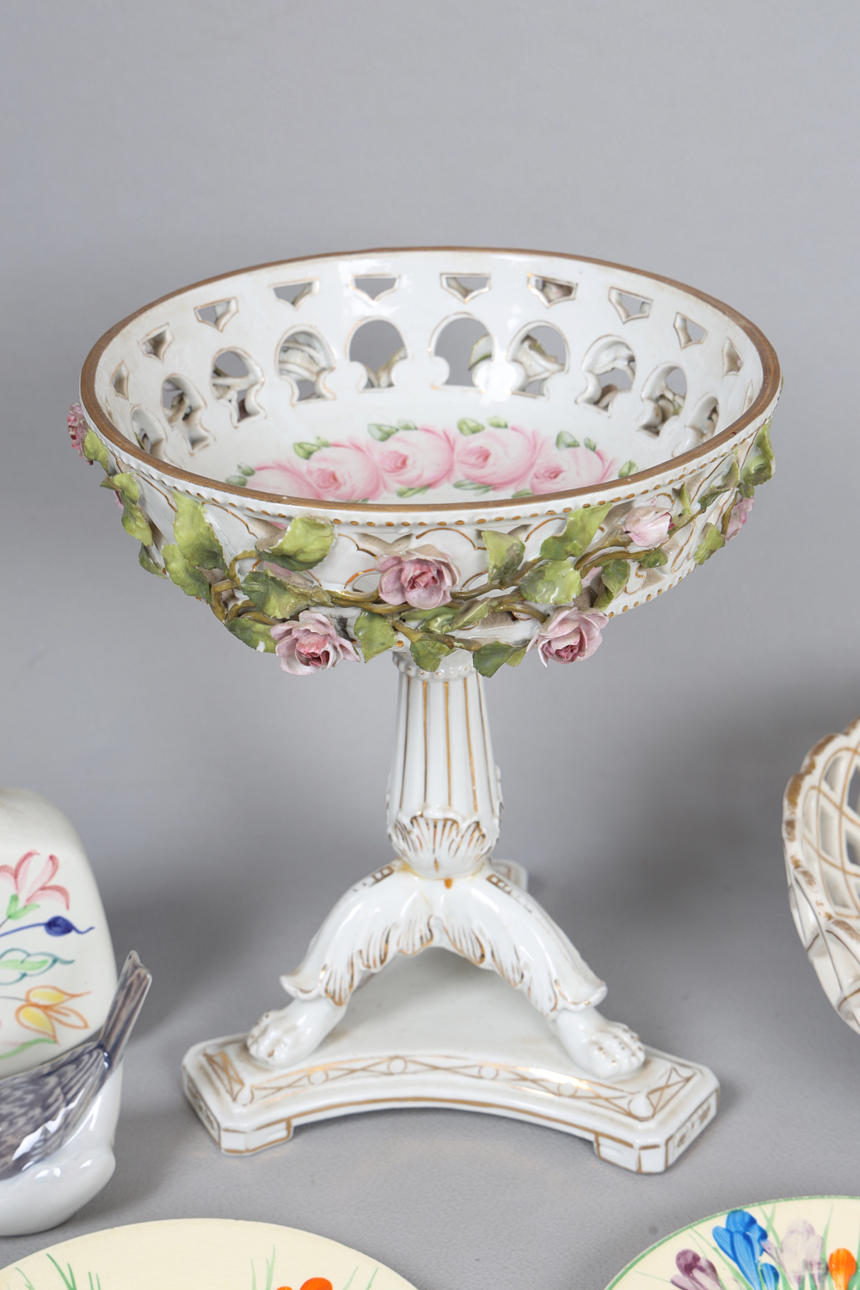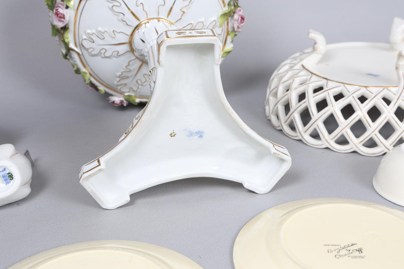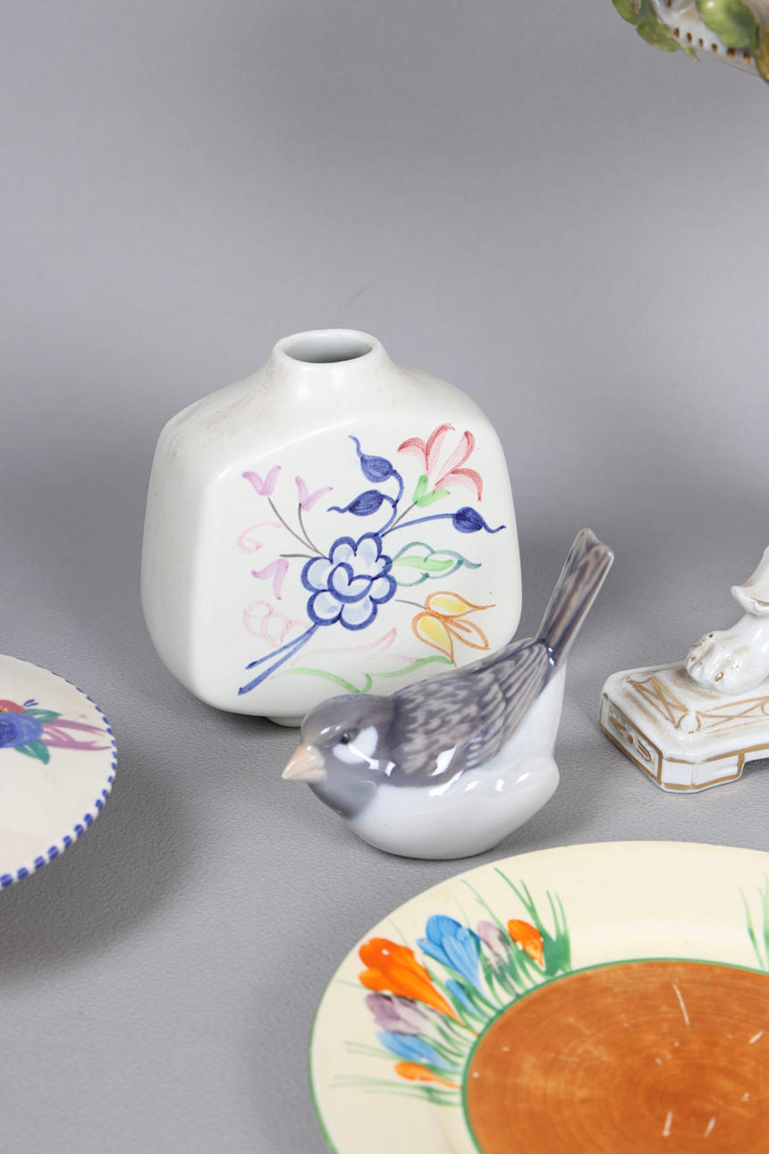 To include two Clarice Cliff plates, a Dresen style tazza and a footed bowl, three pieces of poole pottery, Royal Copenhagen bird, the largest 25cm high.