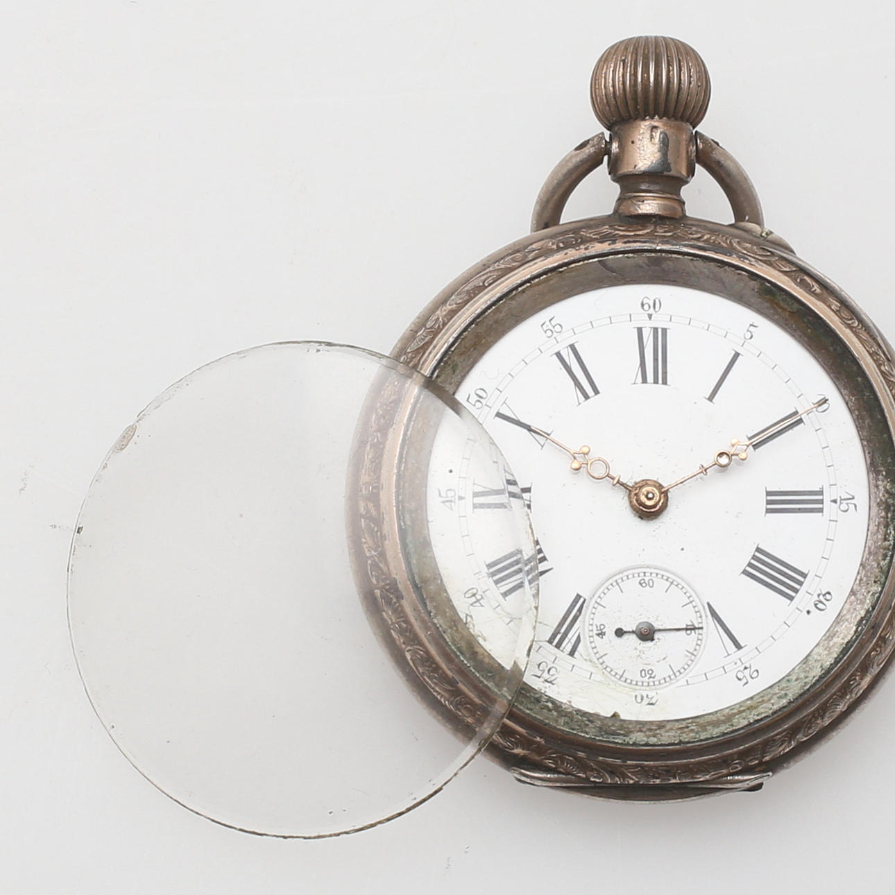 Bruksslitage, ärgat, sprickor på urtavla, löst glas (naggat) medföljer.