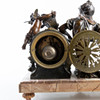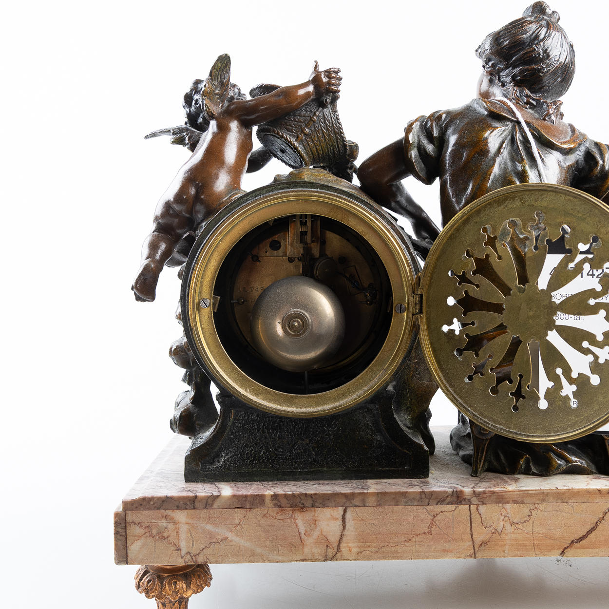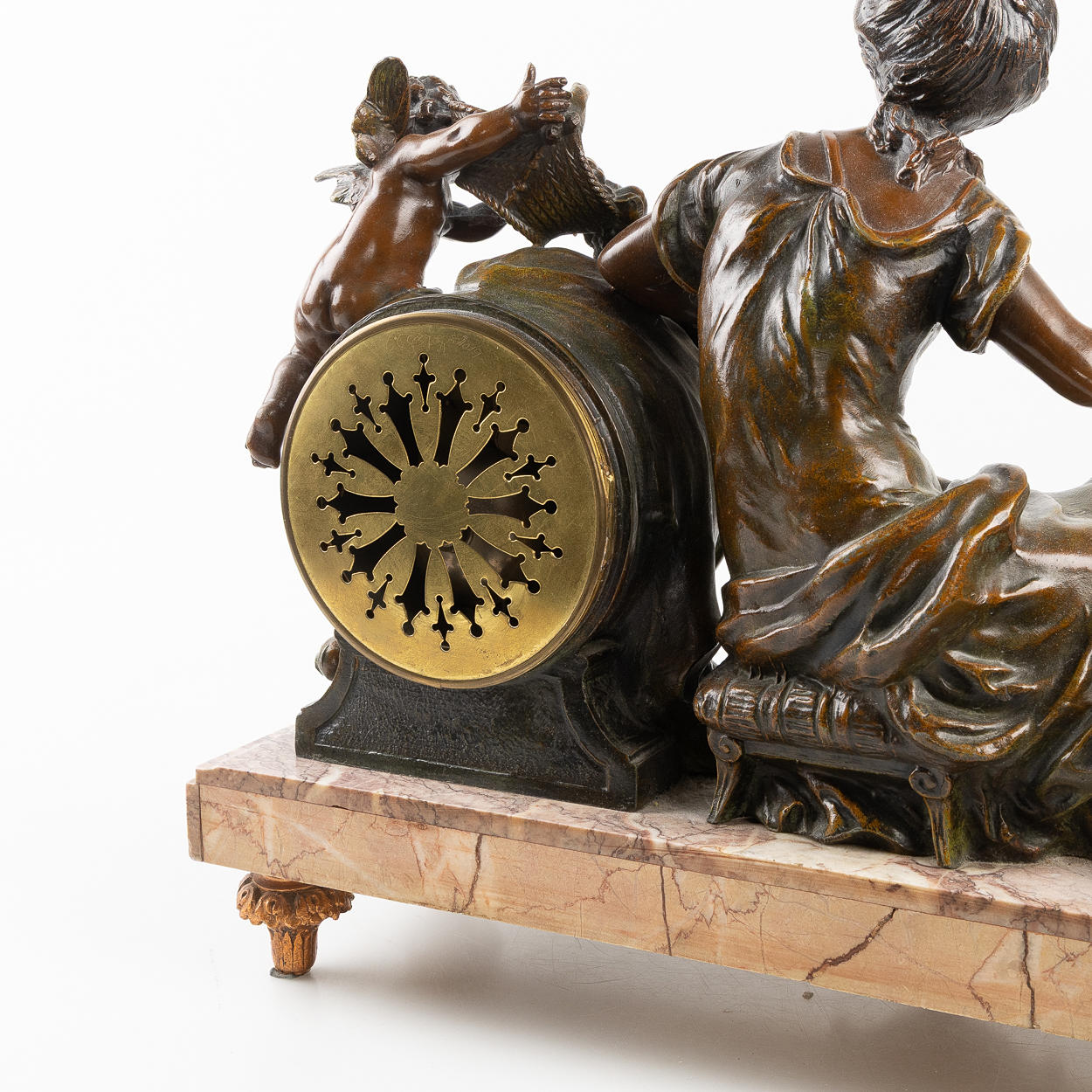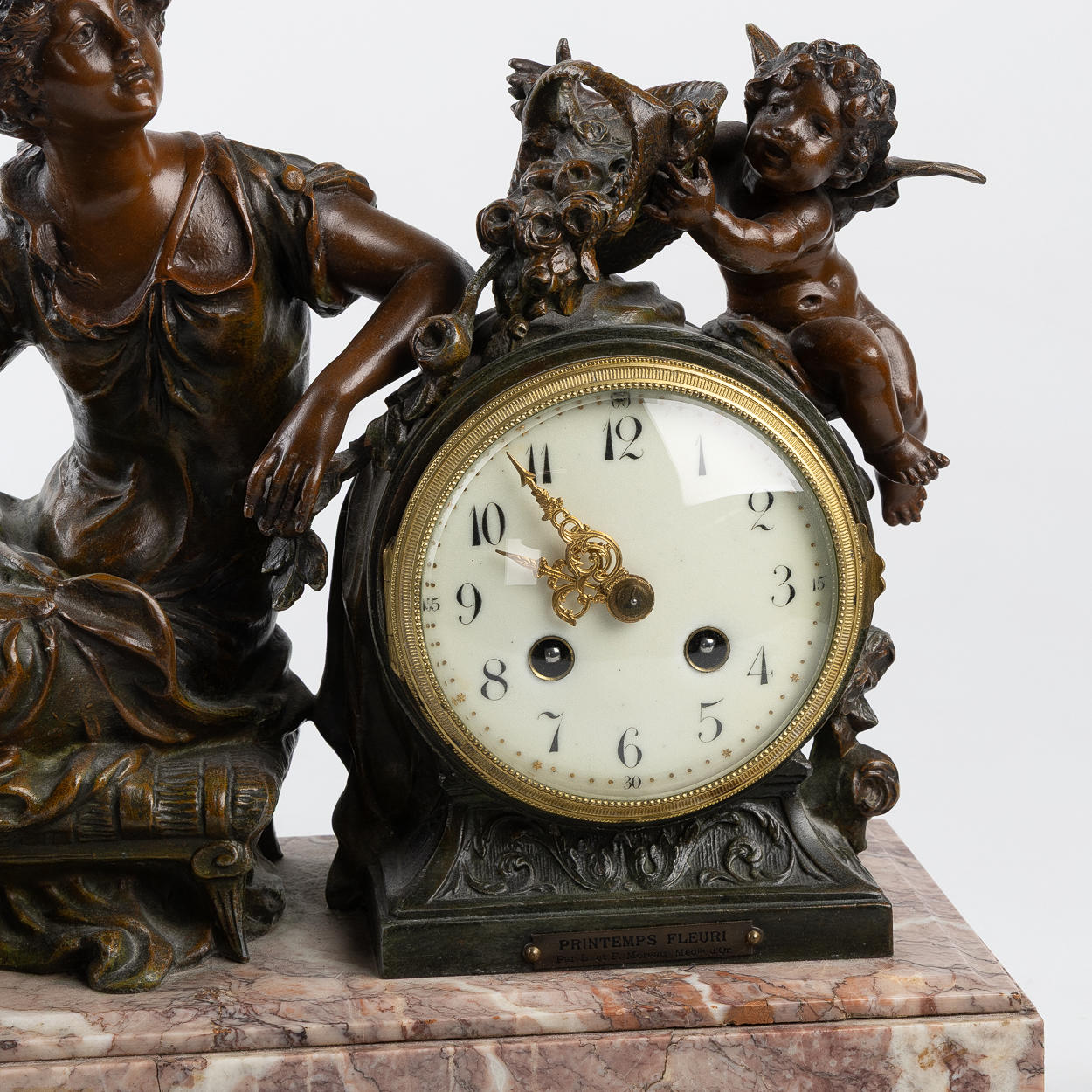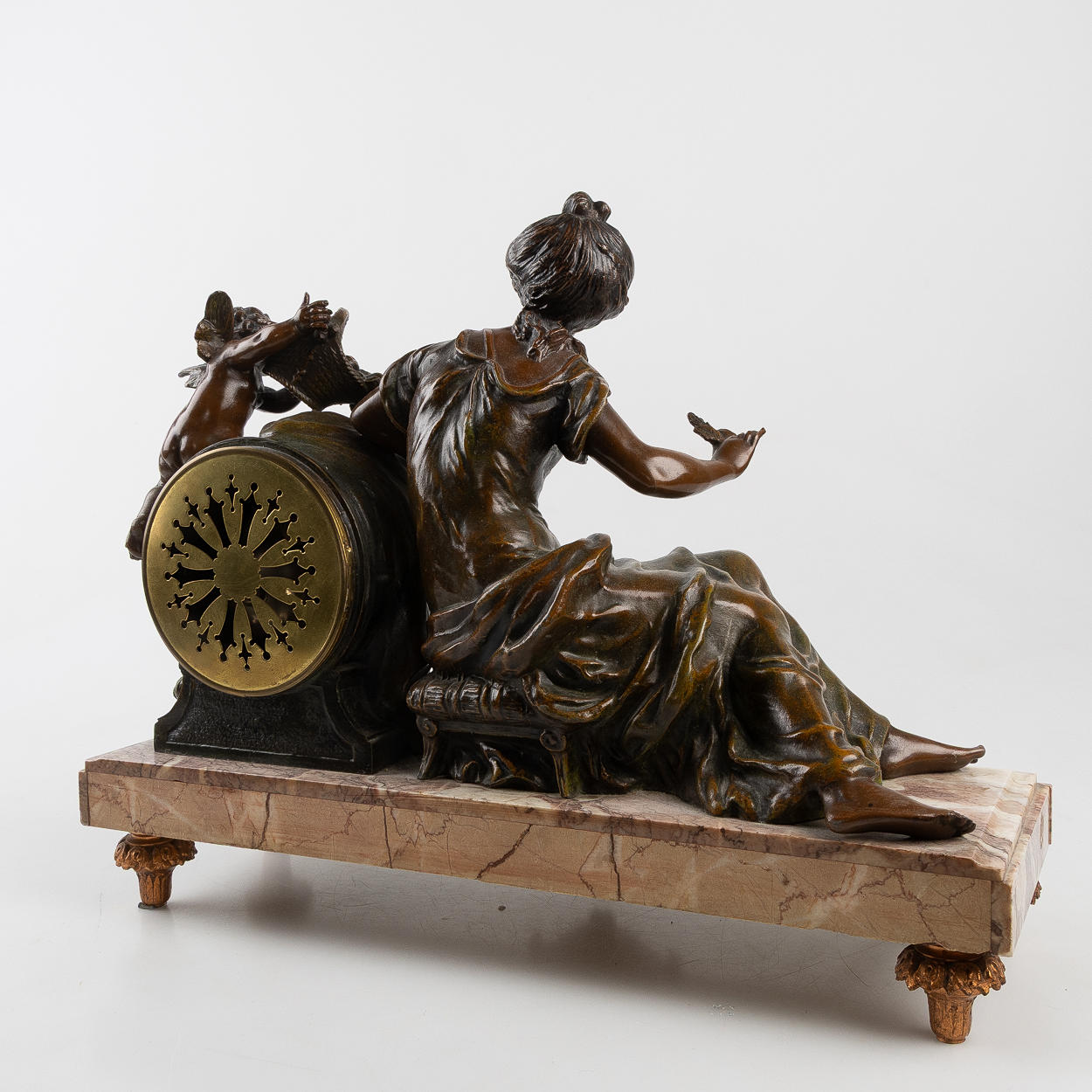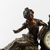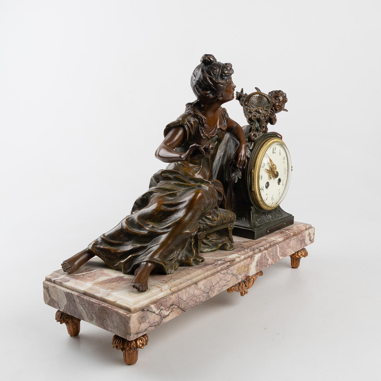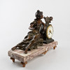 Decor with woman and putti, patinated metal, marble base, dial with Arabic numerals, height approx. 35, 44x15 cm.