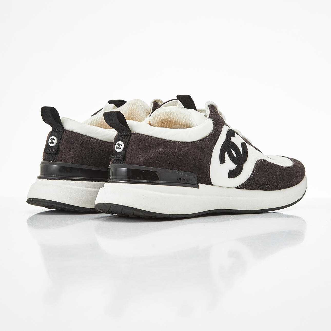 Black and white sneakers, in nylon and black suede, CC logo on the side and back, black and white sole with mesh pattern, marked “Chanel”, size 38, length approx. 28, height 11 cm.