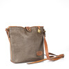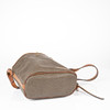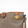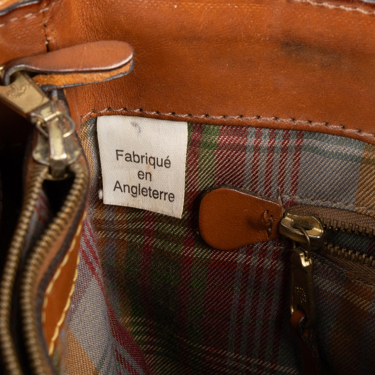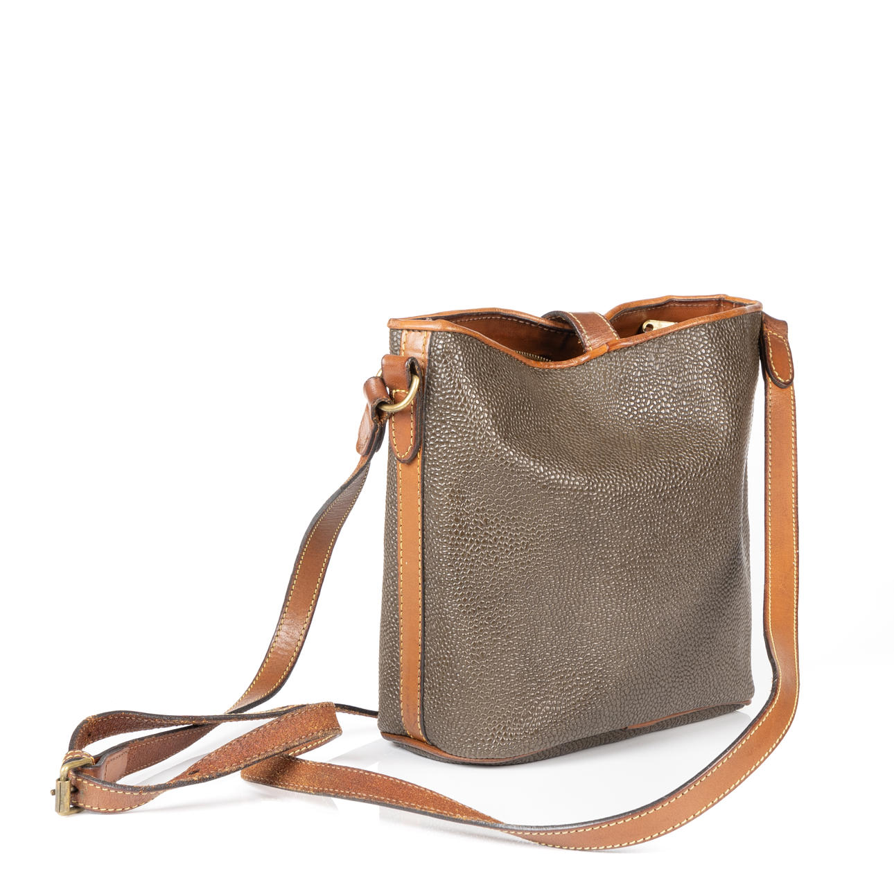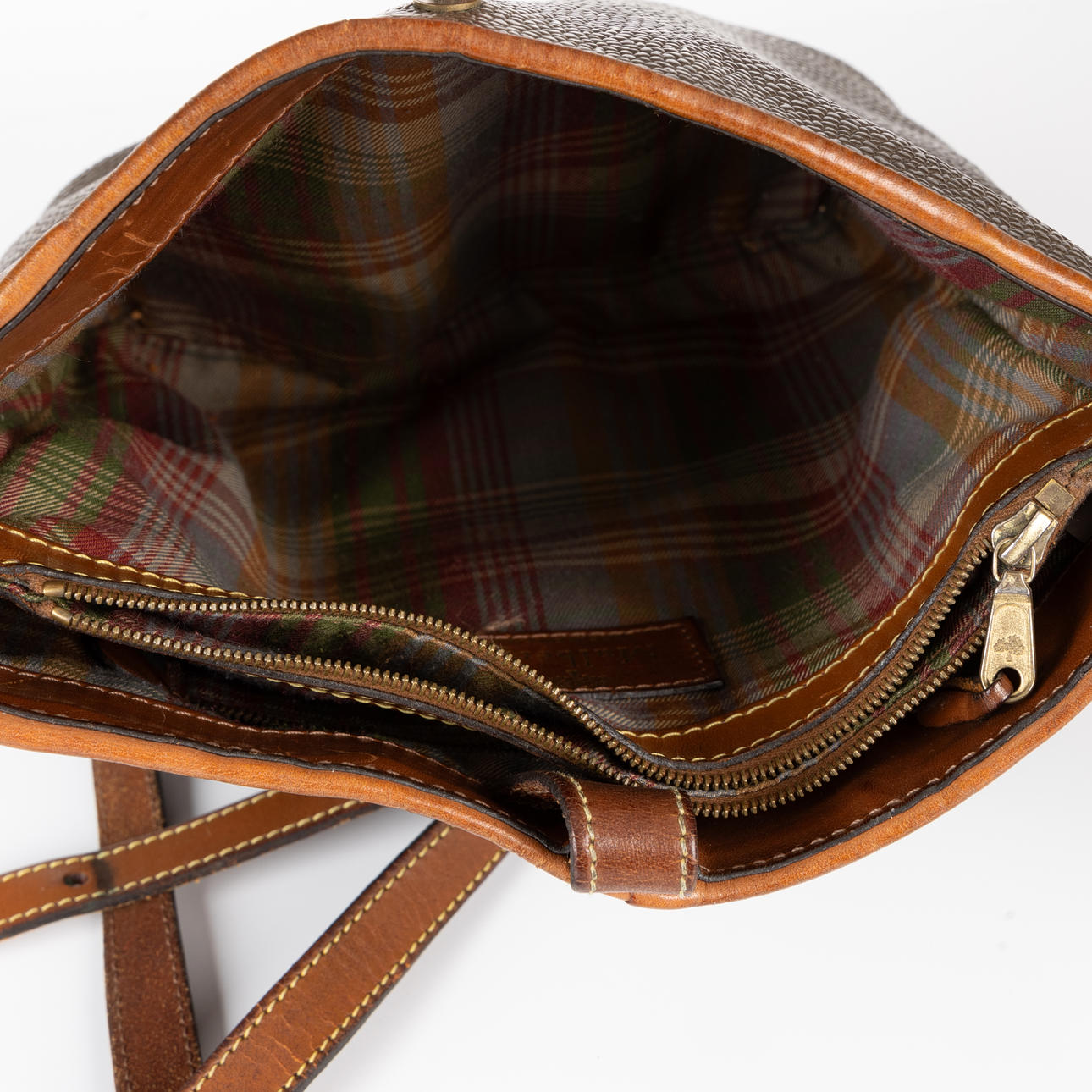 Shoulder bag in scotch grain and brown leather, with yellow metal fittings. Inside with compartments and side pocket with zipper closure. Washer serial number marked.