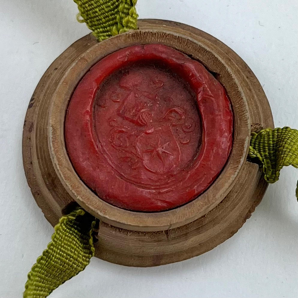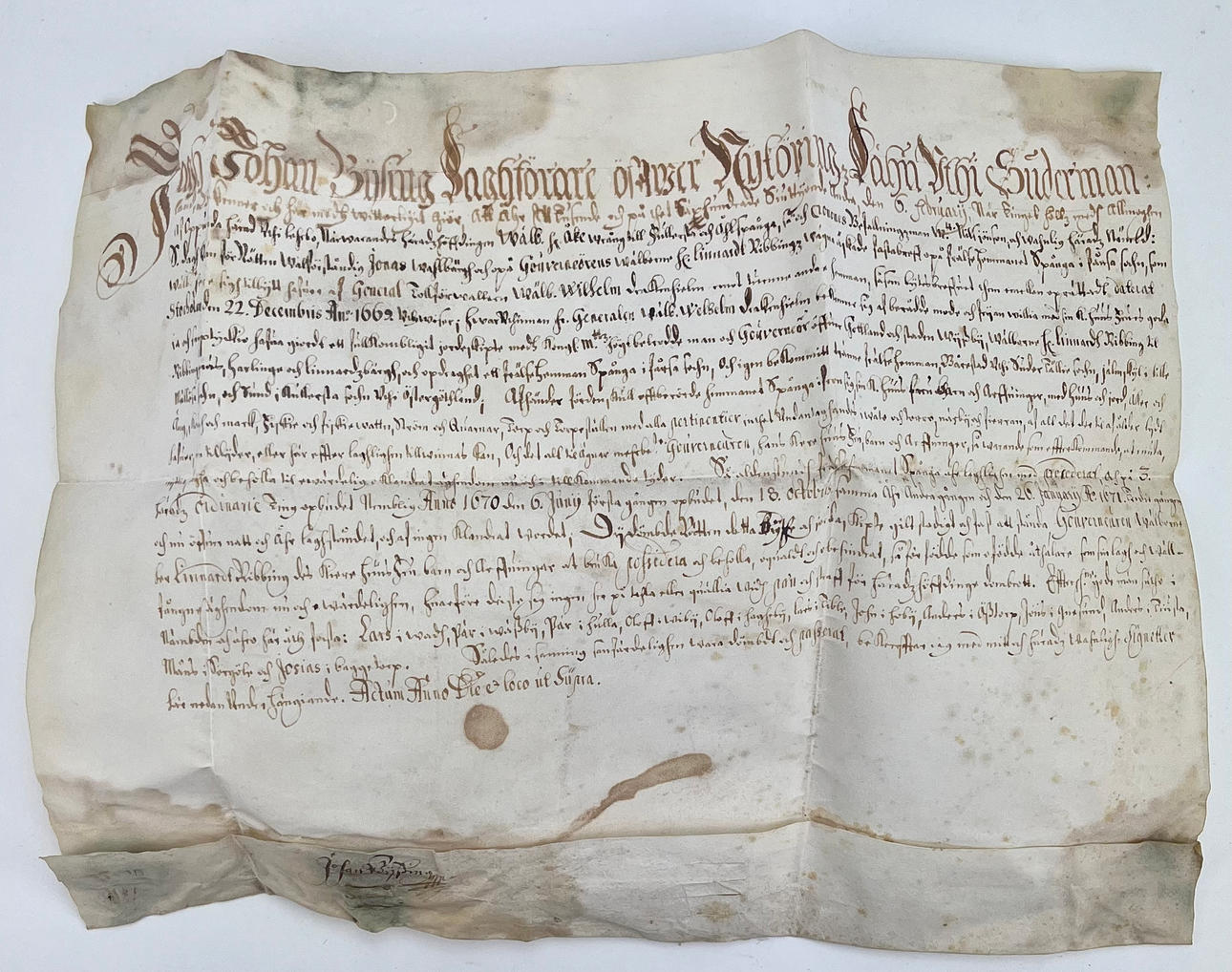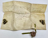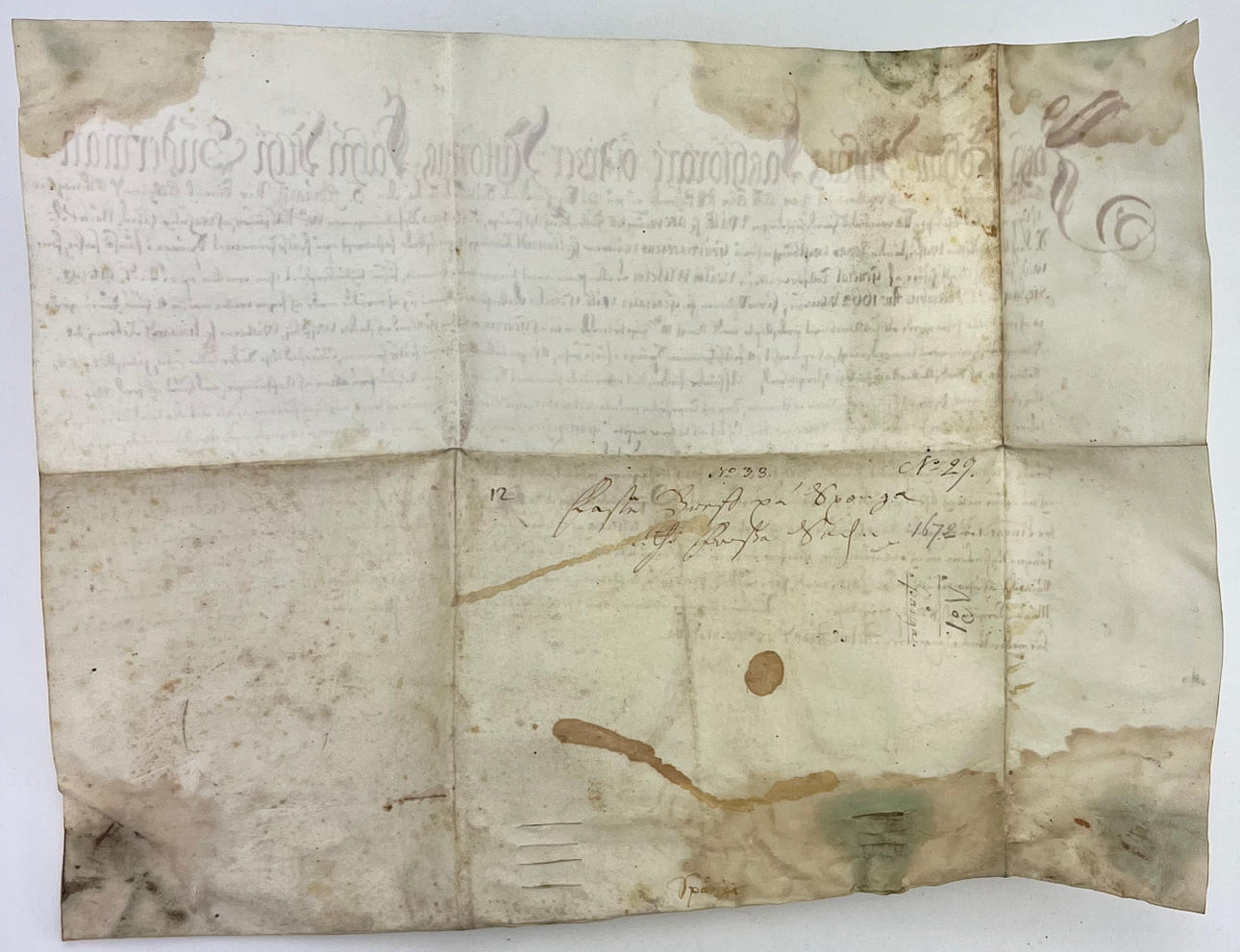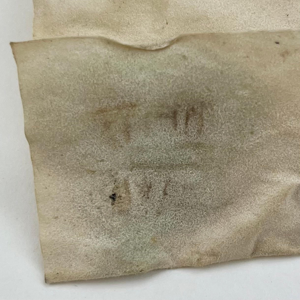 Folded. Use and age-related wear and damage. Lid missing to seal. Stains.