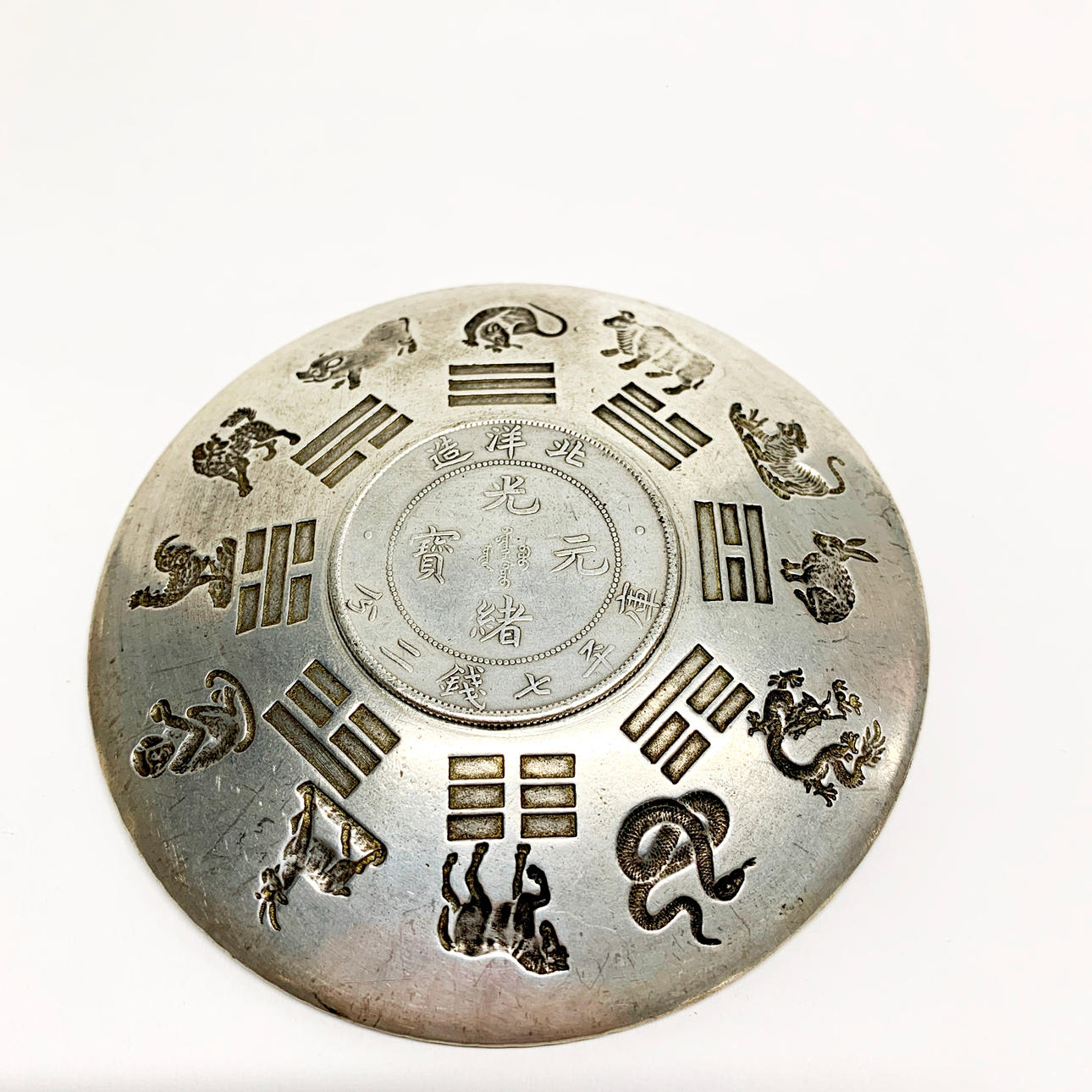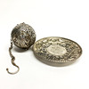 A Chinese white metal dish with a white metal pomander, dish Dia. 10cm.