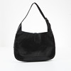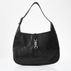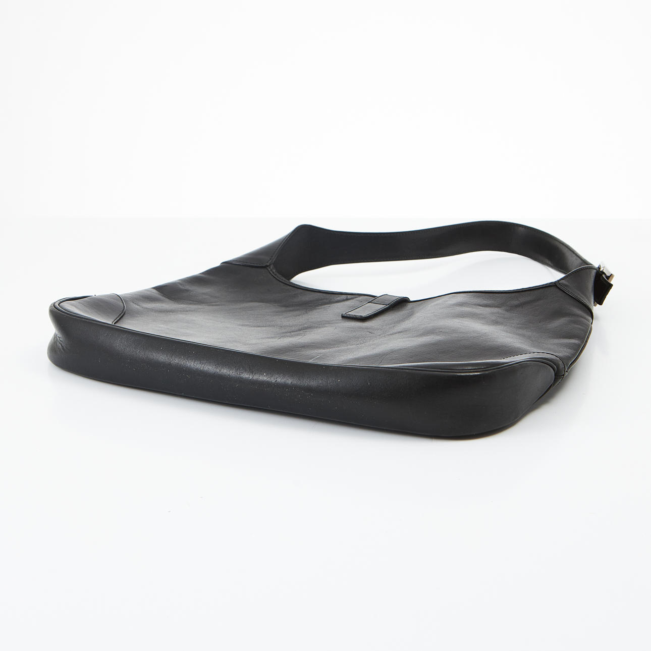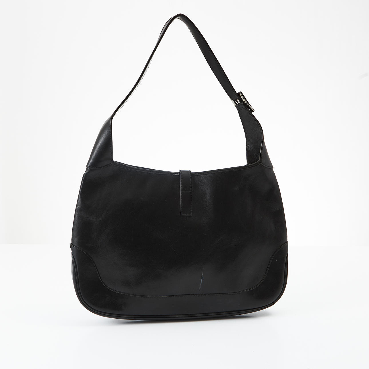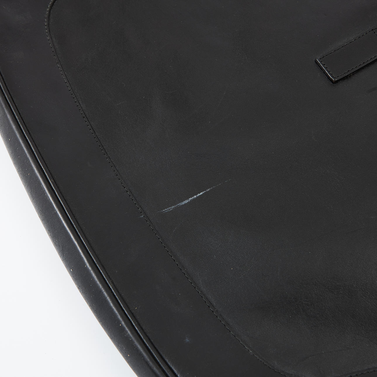 In black leather, buckles in oxidized metal, lined in black textile, inside with a zippered pocket, marked “Gucci made in Italy”, dimensions approx. 38x26x5cm.