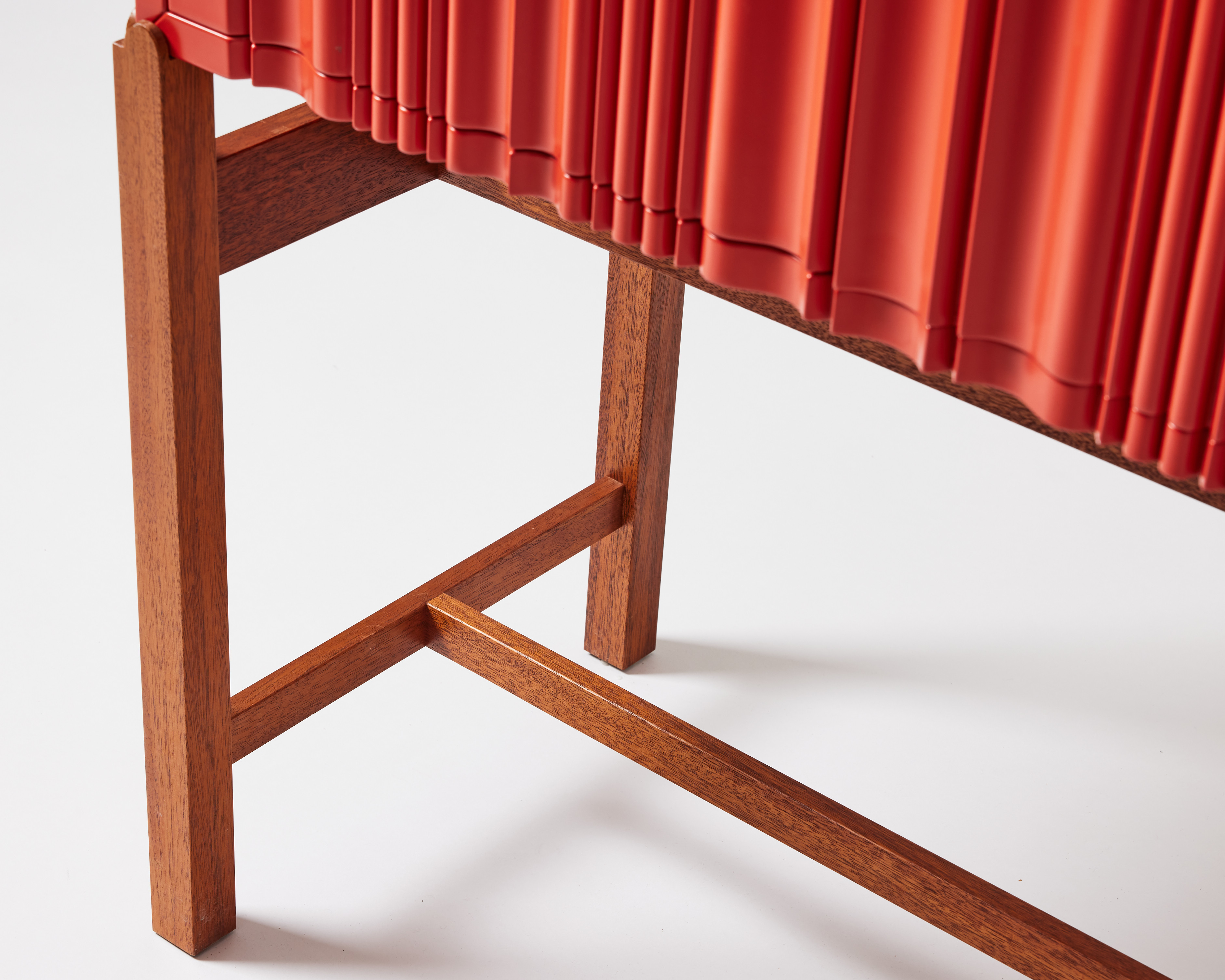 15. 4199727. JOSEF FRANK. “Corrugated cardboard cabinet”, Firma Svenskt Tenn, model number 2192, designed in 1954, painted in red with leg stand and interior in mahogany.