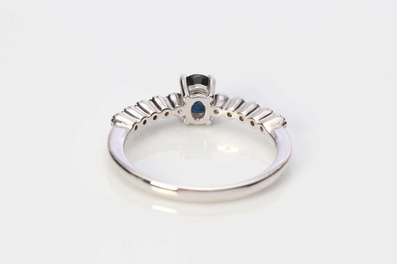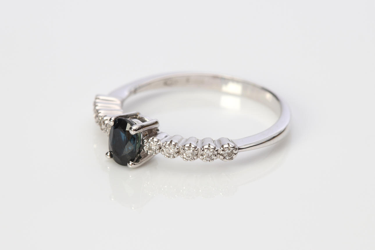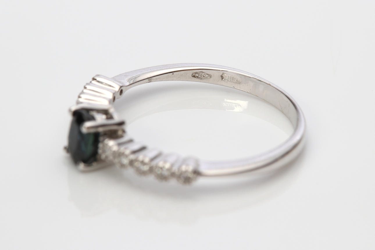 Ring in white gold 18k with a faceted sapphire ca 0,55 ct and brilliant cut diamonds, size. approx. 16,75 mm, total weight 1,8 g.