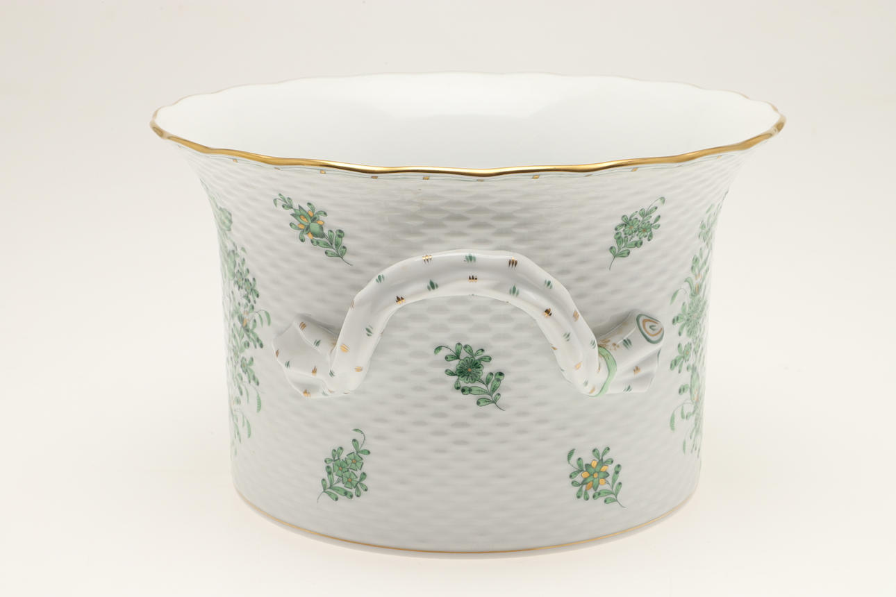 A Herend two handled porcelain jardiniere, painted with green flowers and leaves. Marks to the base, 'Herend, Hungary, 7233'. Rim 25.5cms diameter.
