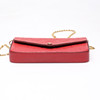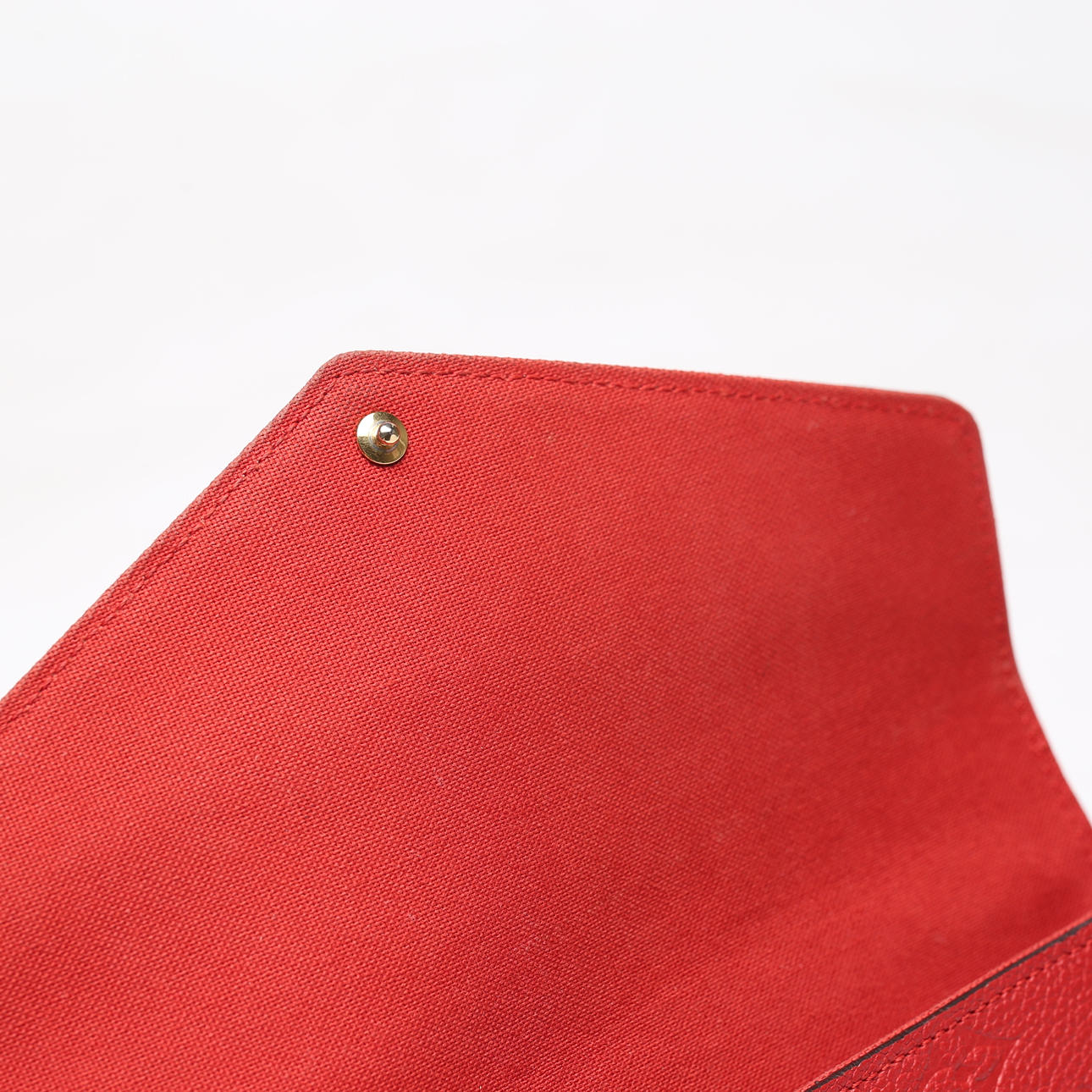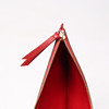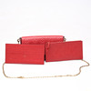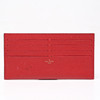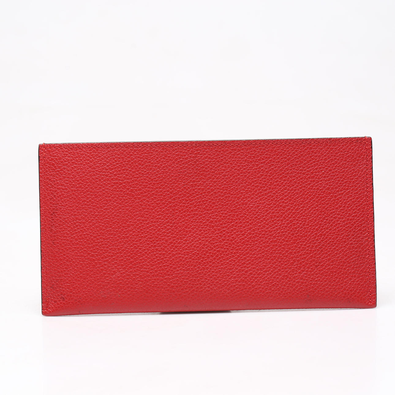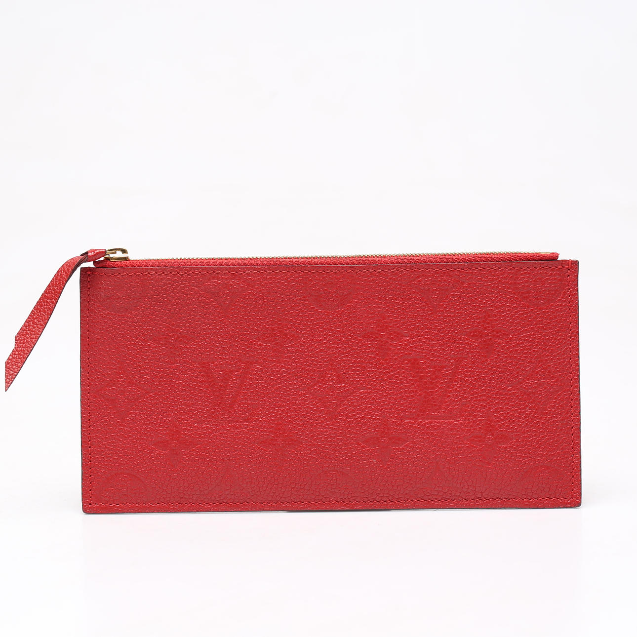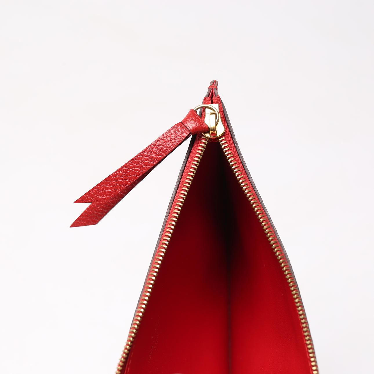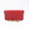 Monogram embossed red leather, with details in plated metal. Inside loose pouchette and card holder.