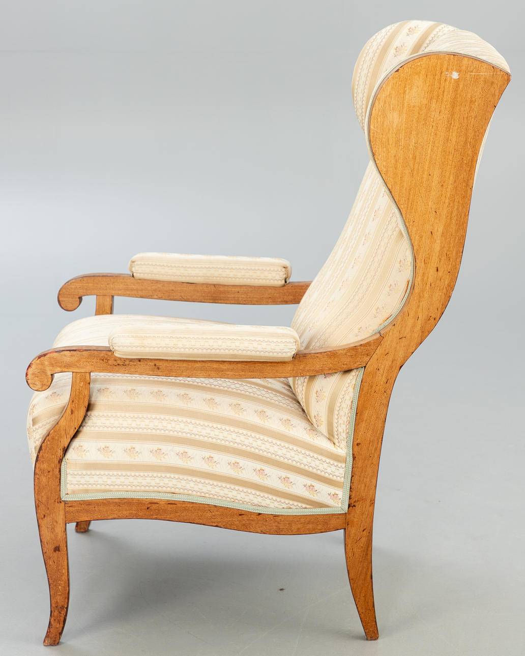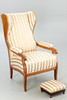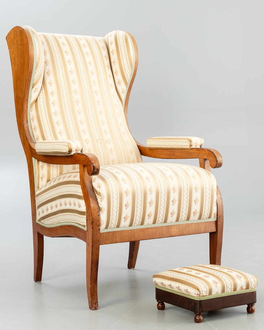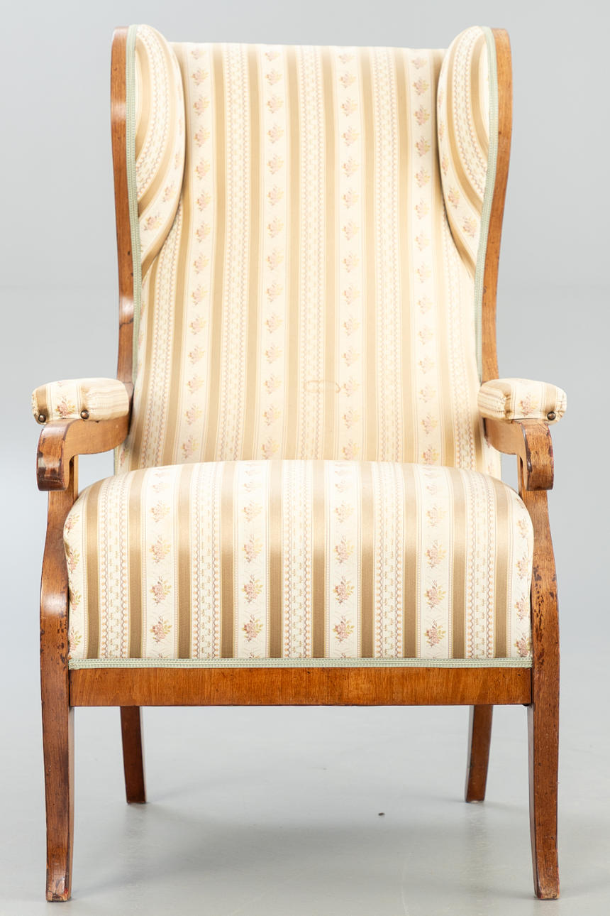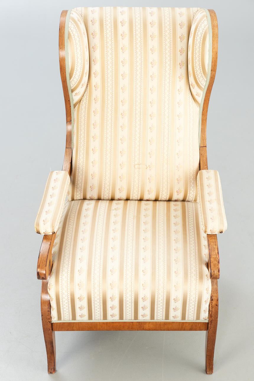 walnut. Square legs, slightly curved at the front, corresponding to the sides of the rectangular frame and the arm bars. The high backrest, seat and armrests are upholstered. Textile cover patterned in the Biedermeier style. Ca. H. 114 cm x W 68 cm x D 78 cm. Plus a small footrest.