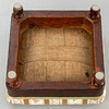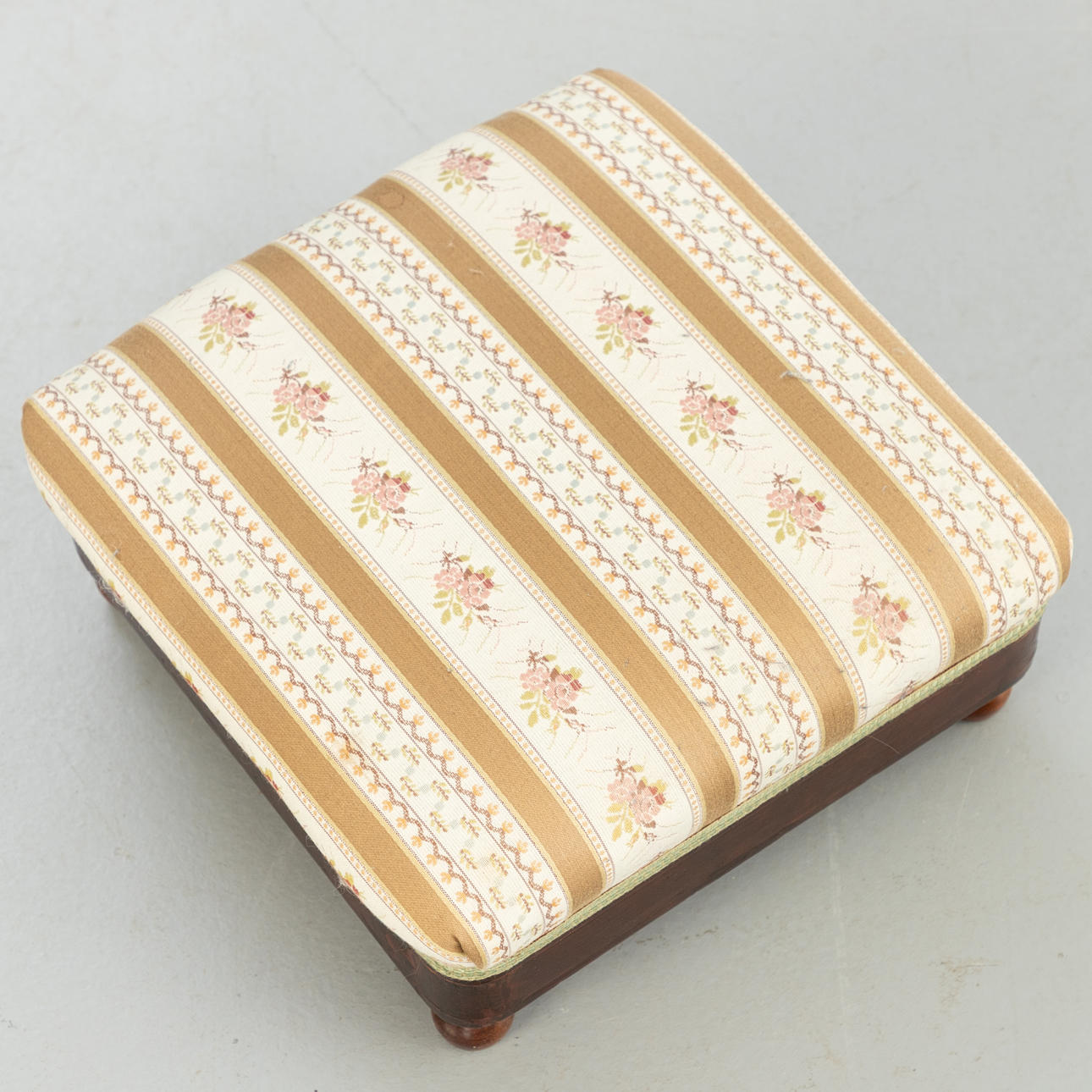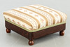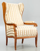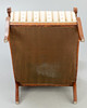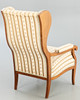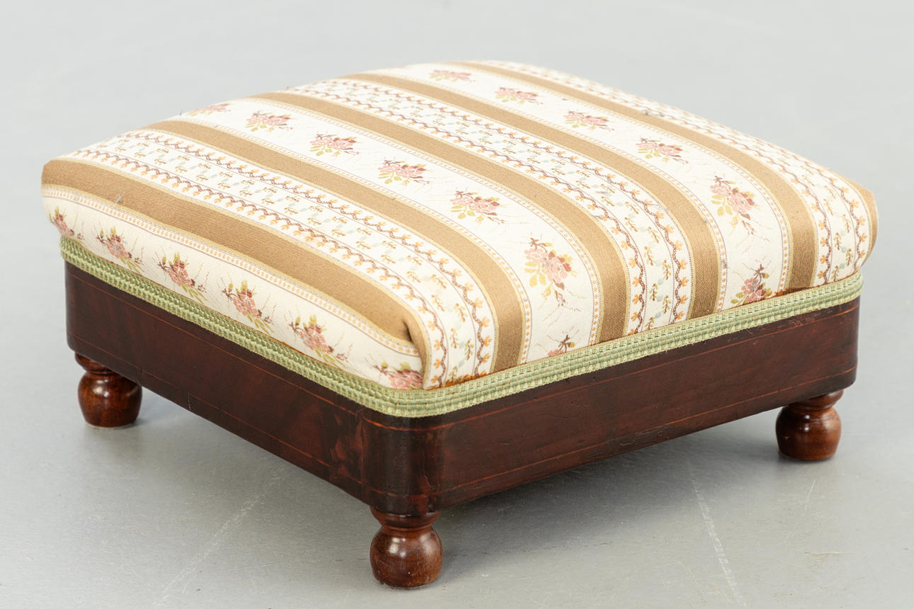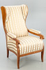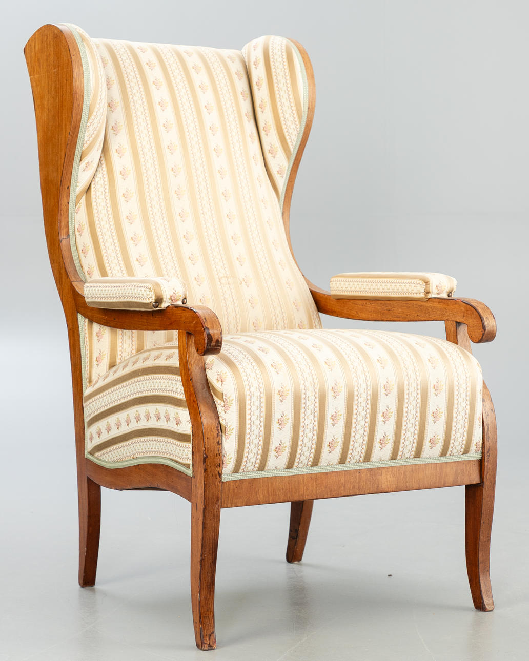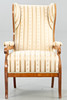 walnut. Square legs, slightly curved at the front, corresponding to the sides of the rectangular frame and the arm bars. The high backrest, seat and armrests are upholstered. Textile cover patterned in the Biedermeier style. Ca. H. 114 cm x W 68 cm x D 78 cm. Plus a small footrest.