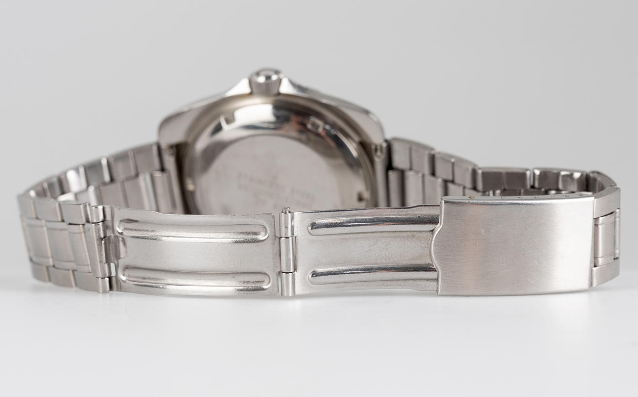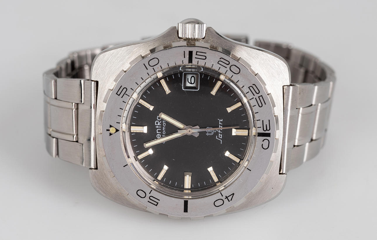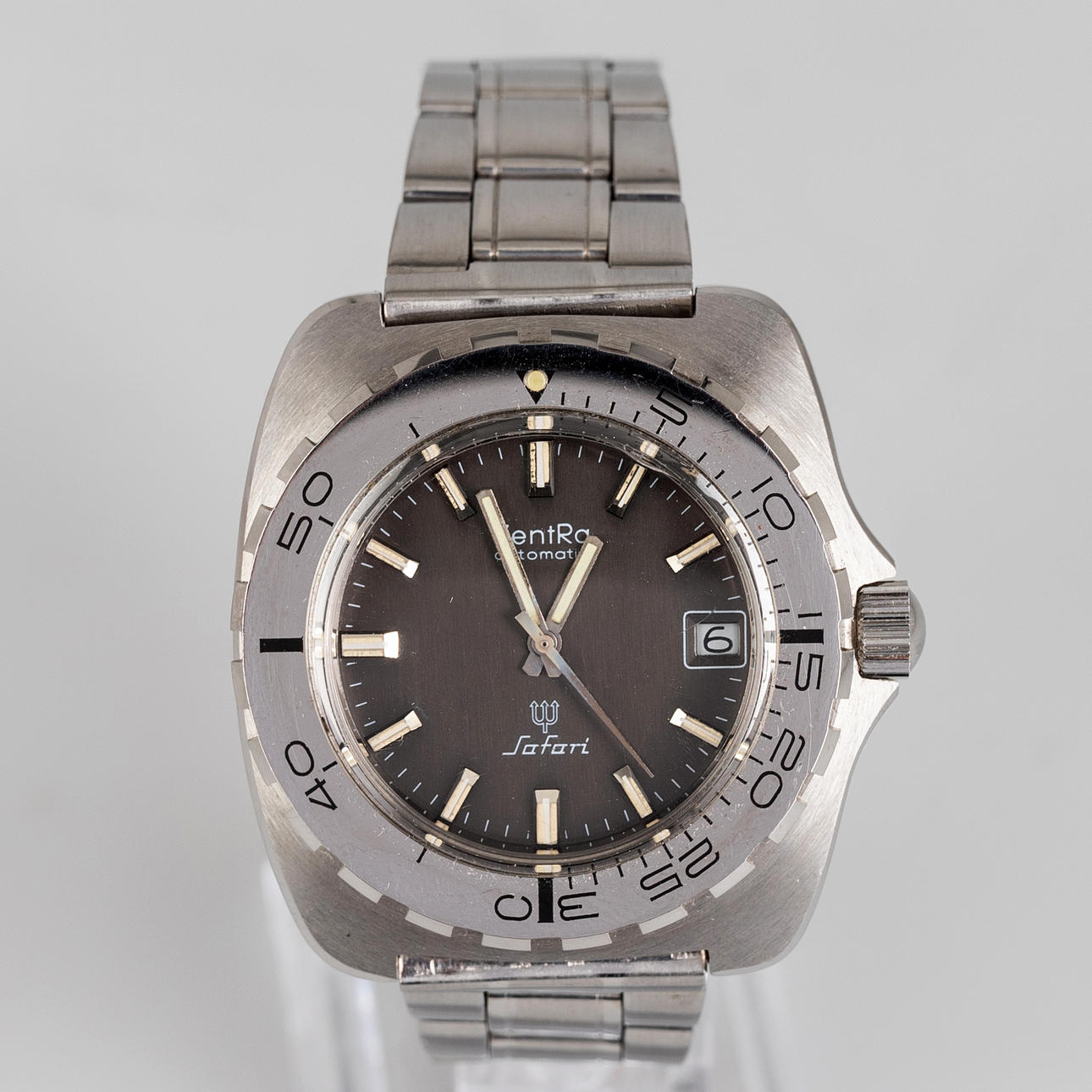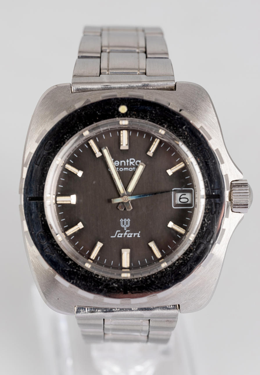 Zentra “Safari” model, stainless steel case, dial with hour, minute and second display, date at '3' clock, two-way rotating bezel, mineral glass, automatic movement. stainless steel bracelet Case dimensions diameter approx. 42mm The clock was ticking at the time of the review, Stockholm's auction shop does not guarantee functionality.