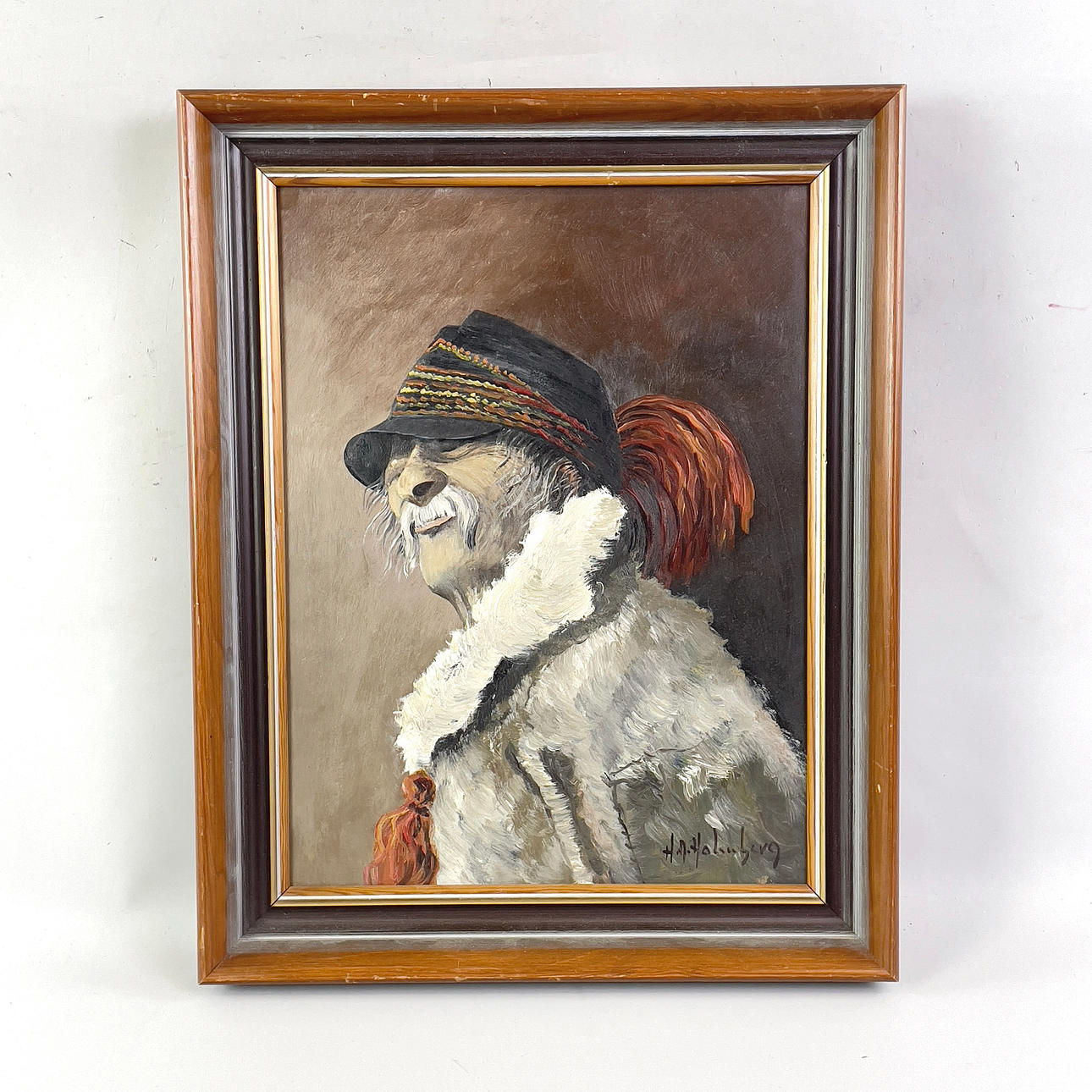 Oil on panel with motif of a Sami man. Signed H A Holmberg. Frame in stained and painted wood. Dimensions frame 48,5 x 38,5, dimensions motif 39,5 x 29,5 cm.