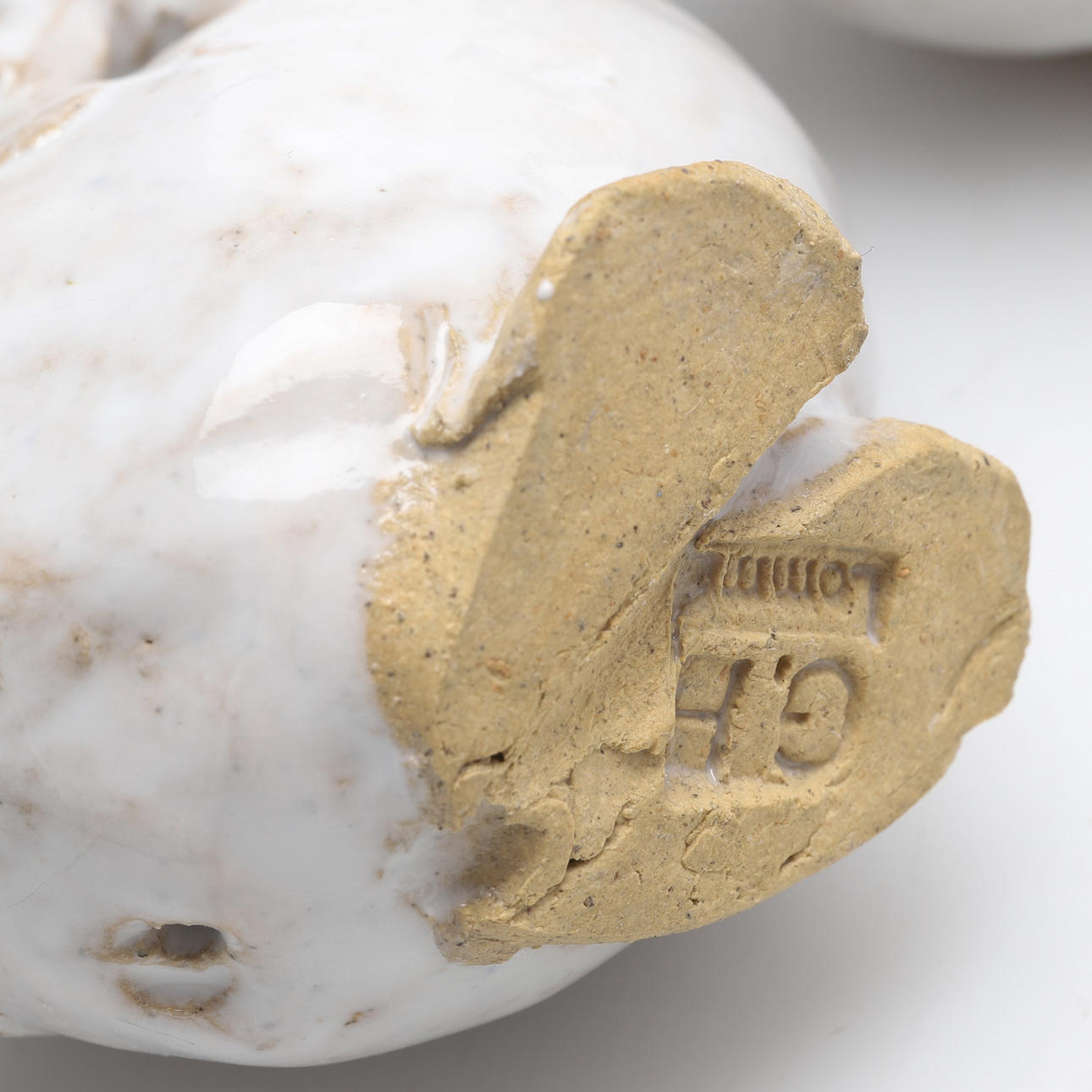 4 pcs larger, white glazed. 3 pcs small, green glazed. Some labeled GH. Height 8.5 cm and less.