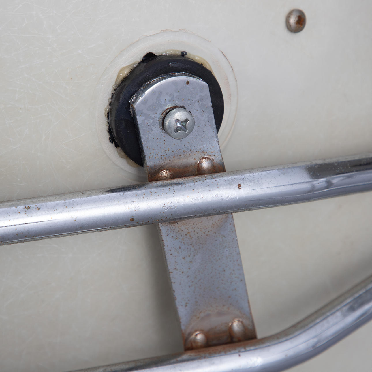 Significant signs of use - in need of restoration. Bumping and small chips in places on the edge of the seat shells. Upholstery crumbles. A pillow with a hole. Base partly welded later. Some plastic feet are missing. corrosion.