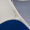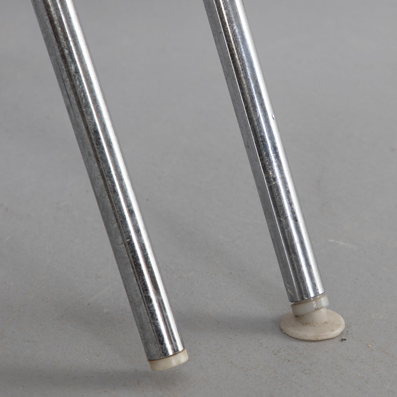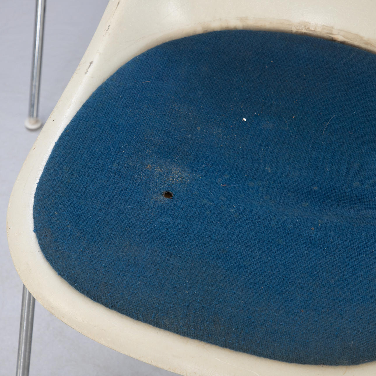 Chrome-plated metal frame seat shell in fibreglass with seat upholstery in blue.