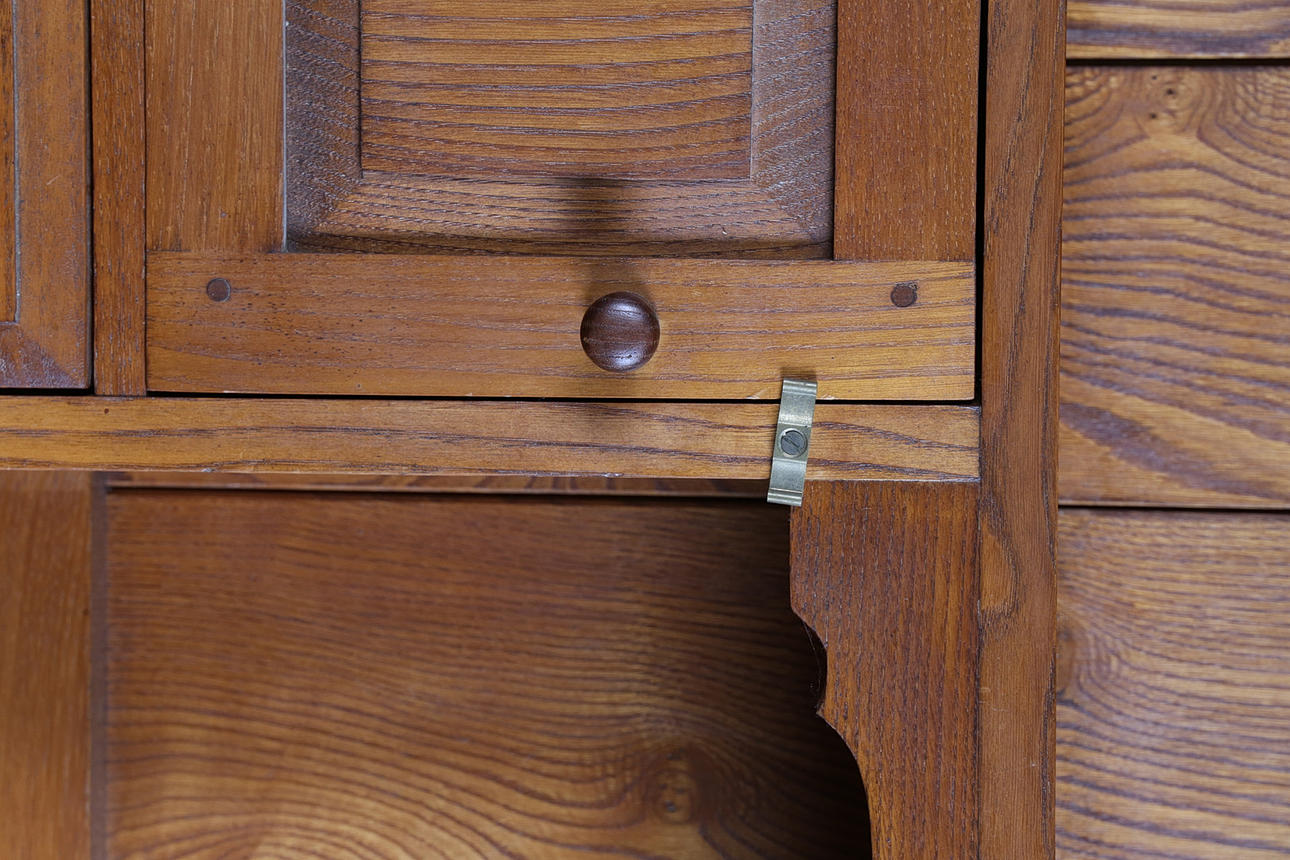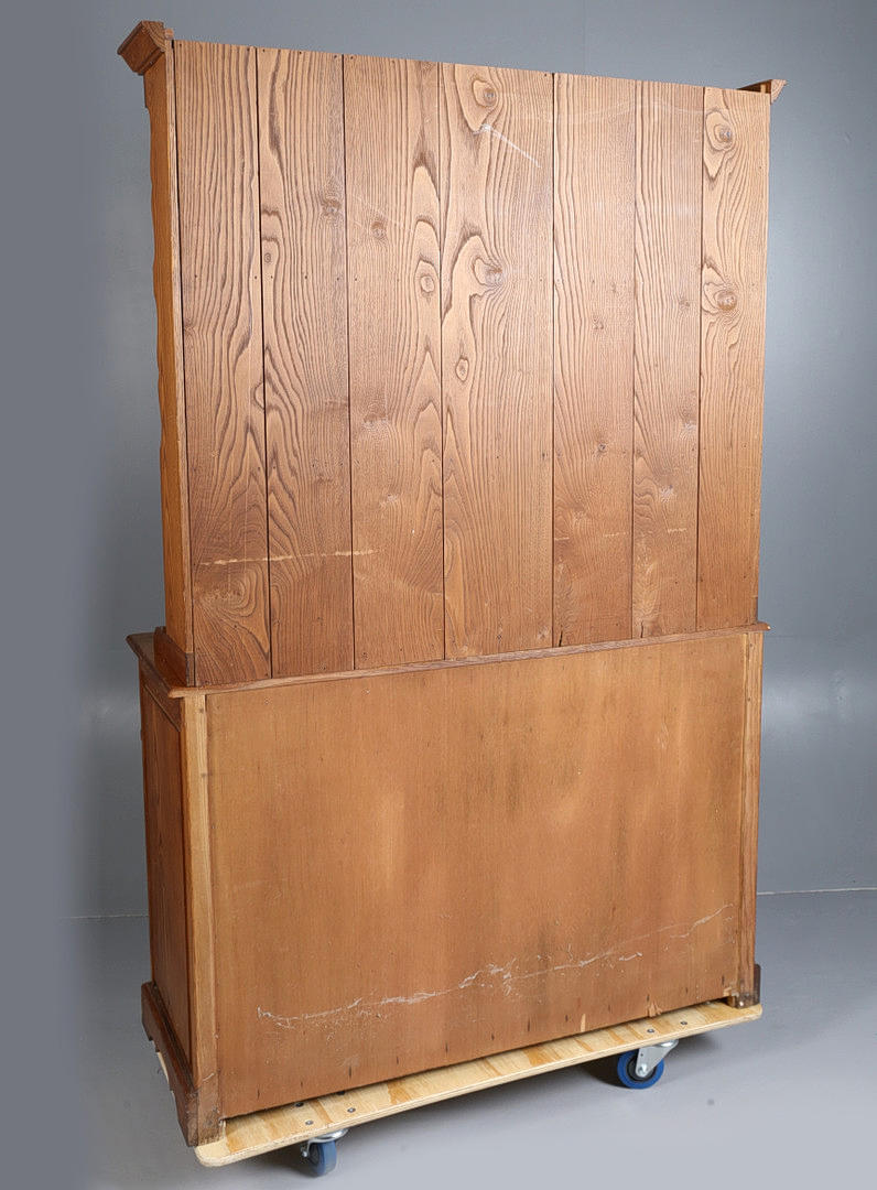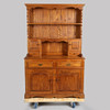 The rack with swept pediment above two shelves, two small cupboards and two drawers, the base with two drawers and two cupboards, 190cm high, 122cm wide, 45cm deep.