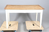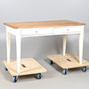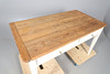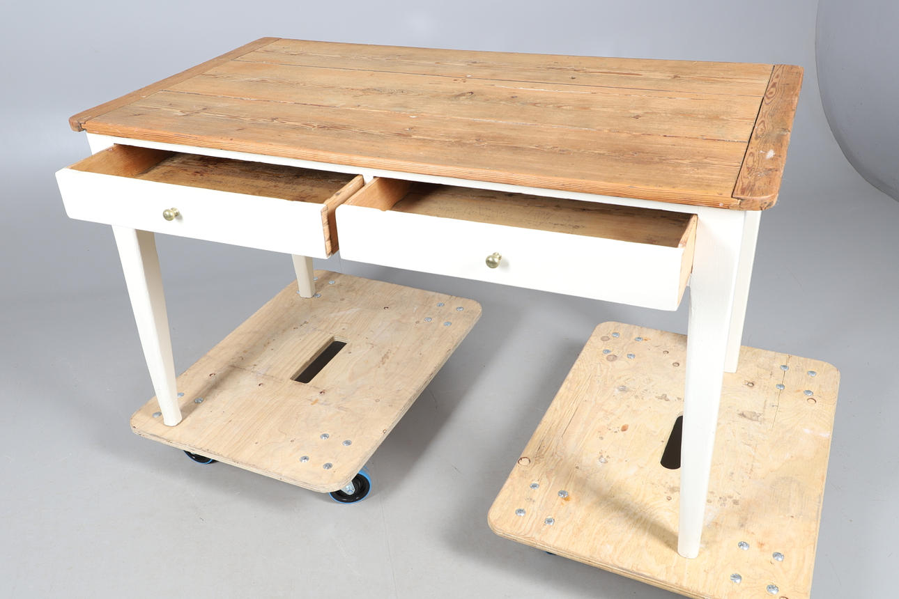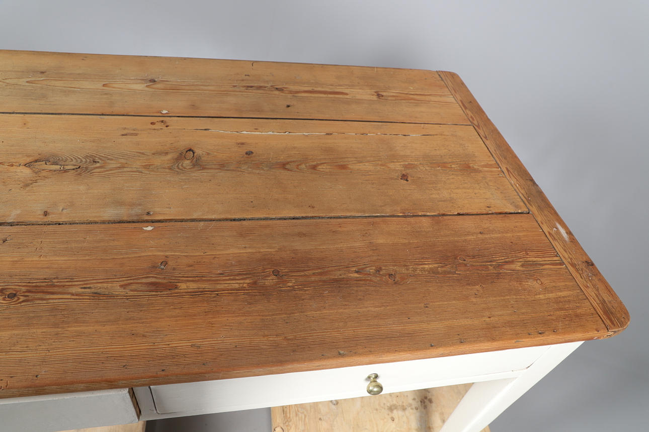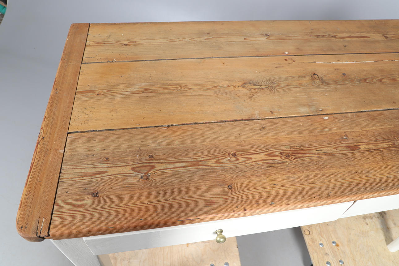 The three plank stripped pine top with cleated ends, on white painted base with two frieze drawers.