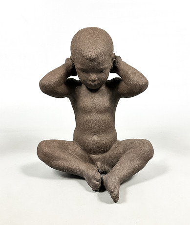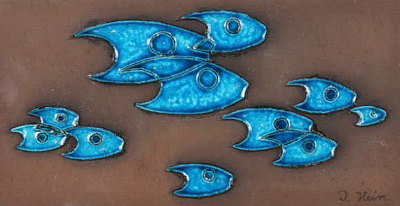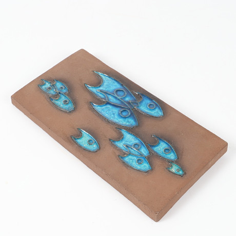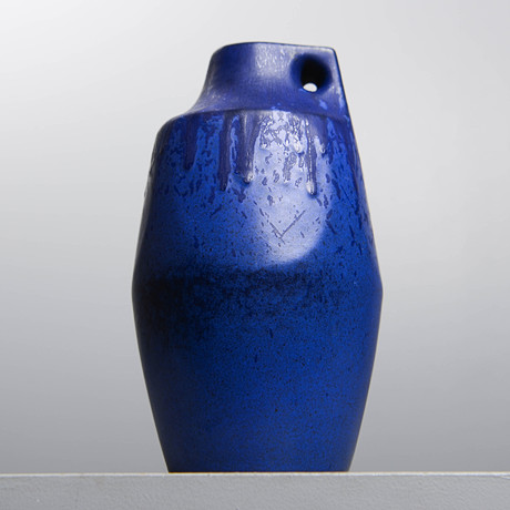 Pottery, probably stoneware, partly blue-glazed. Labelled: “Knabstrup 1951/5, Made in Denmark”. Stamp marked. Diameter 26 cm.