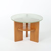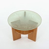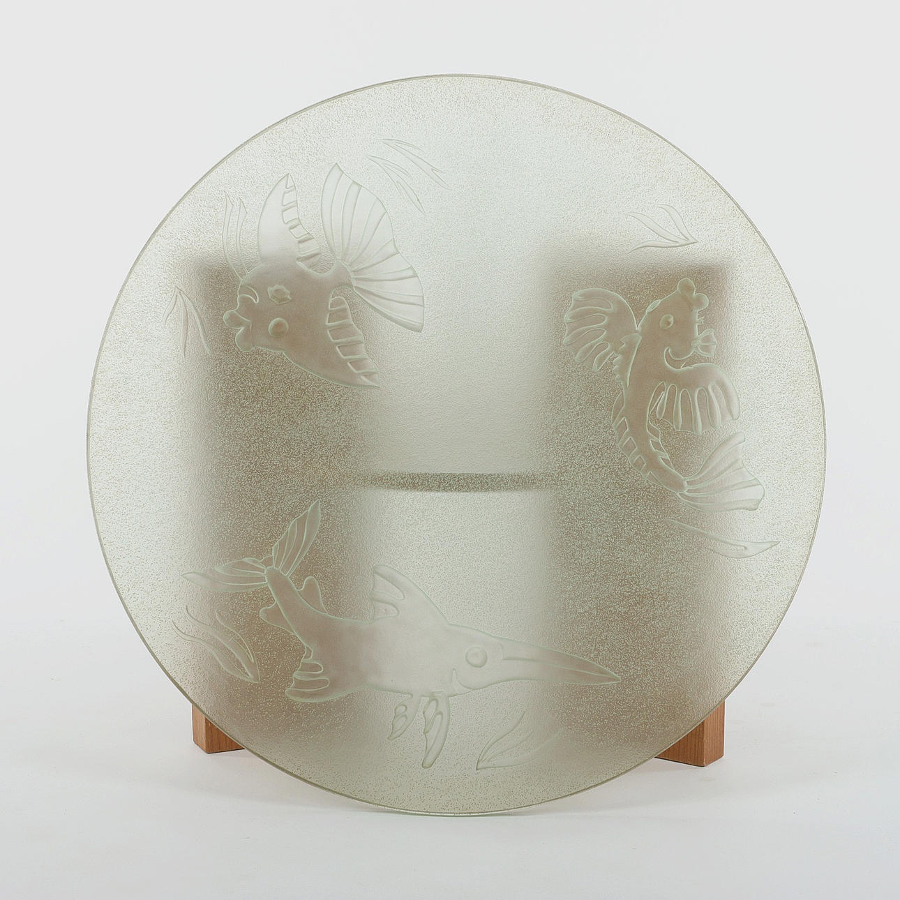 Coffee table, Swedish Modern, base in elm, loose table top in tempered and frosted glass with fish motif.