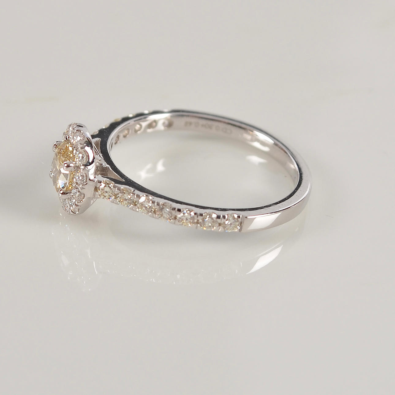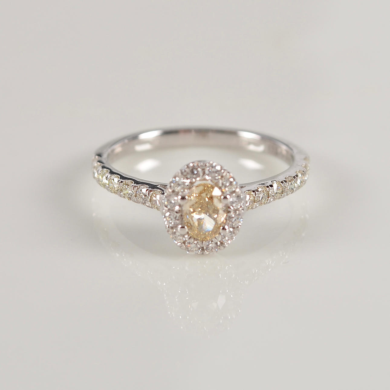 Possessed with an oval cut diamond of 0.30ct ca light yellow/VS and 26 smaller brilliant-cut diamonds totalling 0.42ct Top Wesselton-Wesselton/VVS-VS