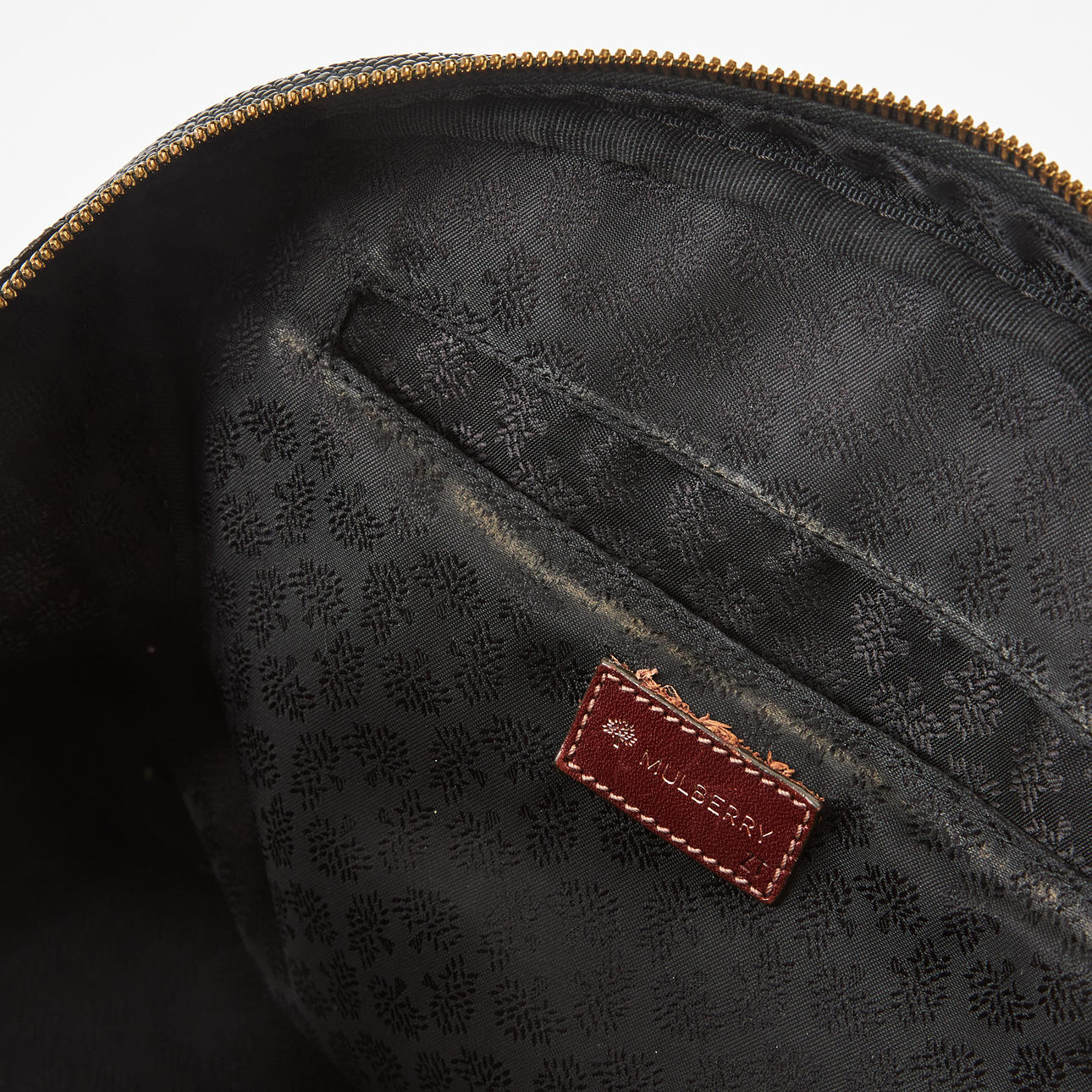 Normal wear and tear, scuff marks, partly dry leather, surface dirt/stains, bottom zipper does not go up completely.