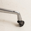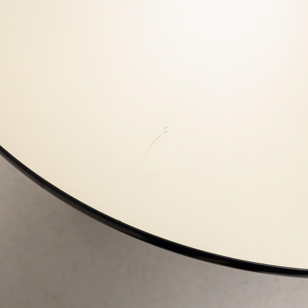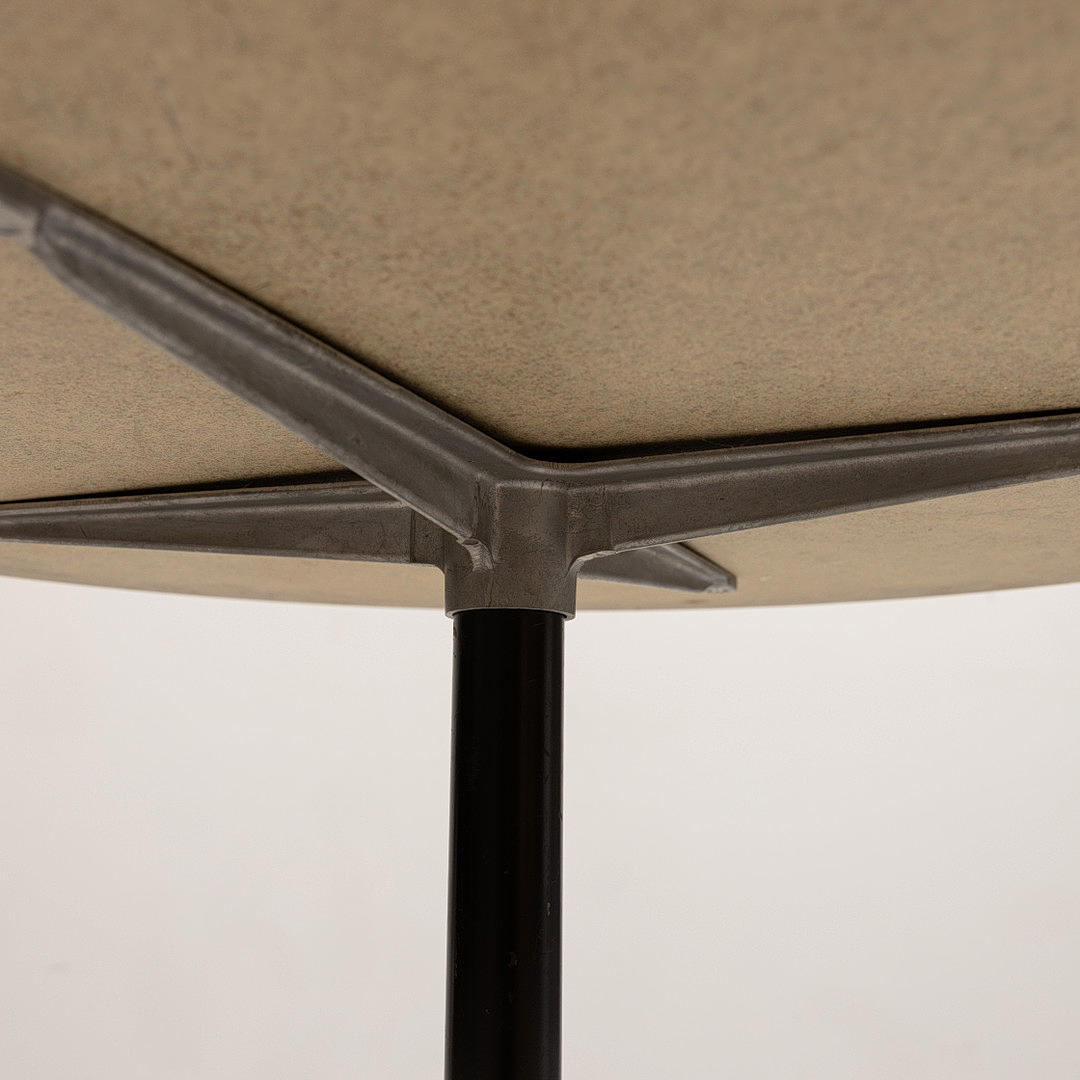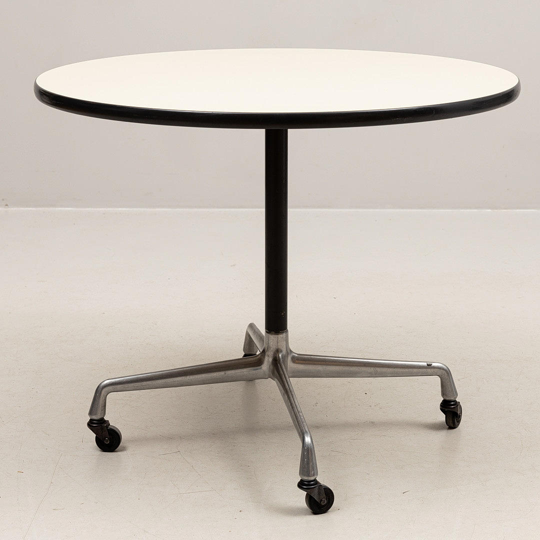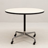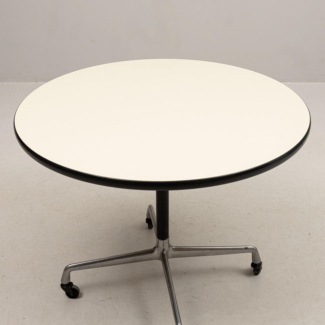 Round beige laminated disc with black edging on wheeled four-piece steel undercarriage. Labeled Herman Miller. Diam 90,5 cm, height 73 cm.